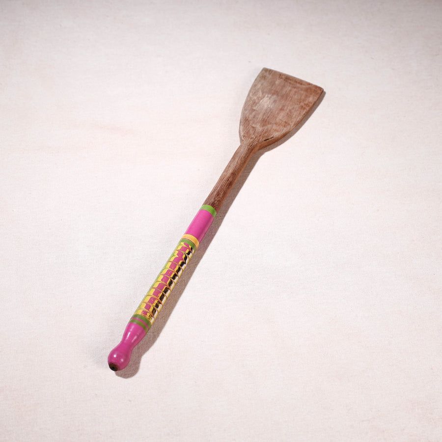 This exquisitely handcrafted cooking spatula is made of babool wood with lacquered colours. This spatula is meticulously handcrafted by skilled artisans from the Vadha community in villages like Nirona and Jura. They begin by selecting babool wood, which is known for its durability and strength. Layers of coloured lacquer are applied to the wood, and intricate designs and effects are chiselled to create a stunning visual appeal.