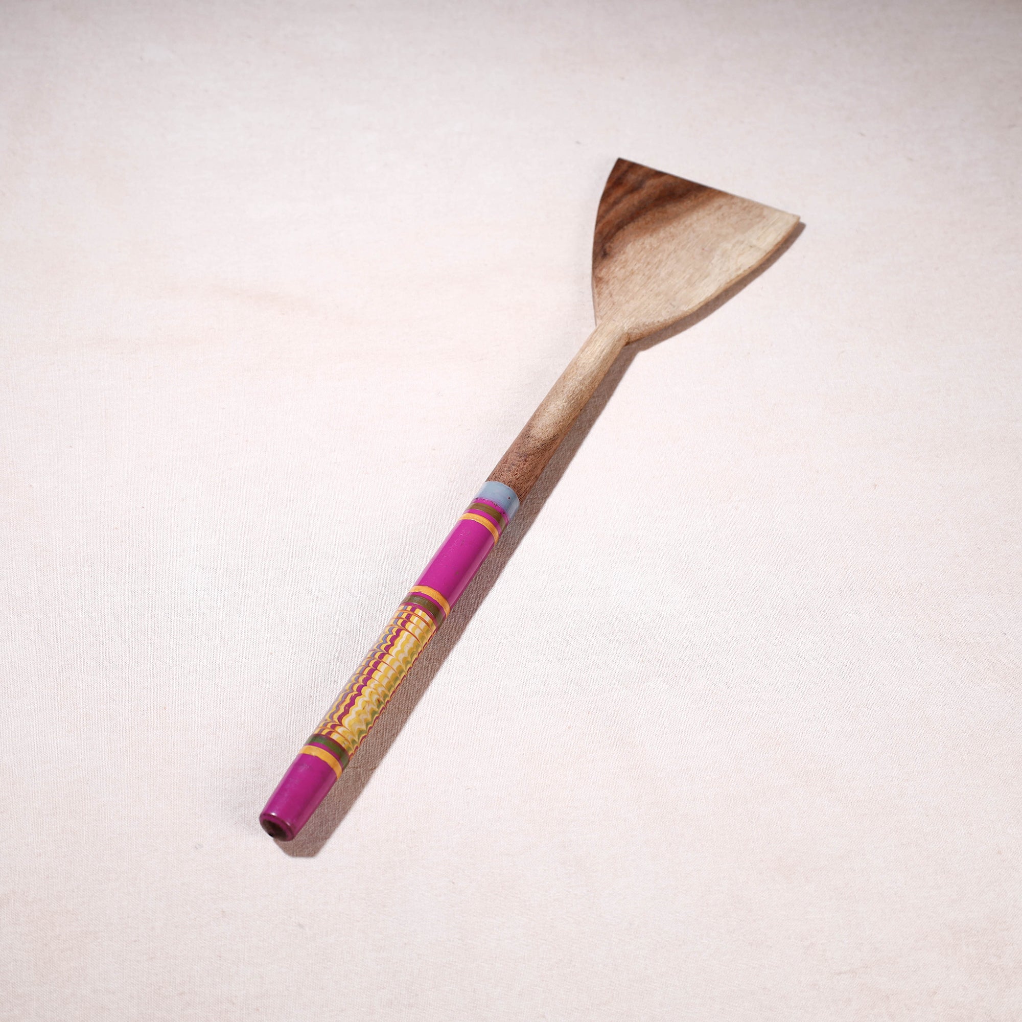 This exquisitely handcrafted cooking spatula is made of babool wood with lacquered colours. This spatula is meticulously handcrafted by skilled artisans from the Vadha community in villages like Nirona and Jura. They begin by selecting babool wood, which is known for its durability and strength. Layers of coloured lacquer are applied to the wood, and intricate designs and effects are chiselled to create a stunning visual appeal.