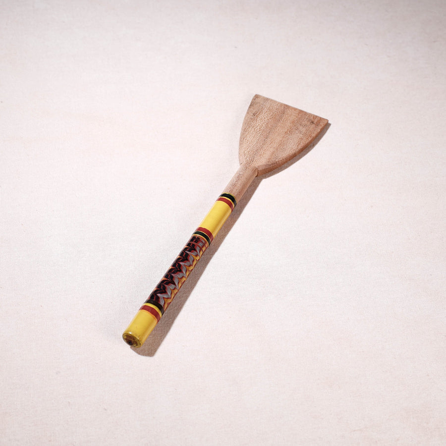 This exquisitely handcrafted cooking spatula is made of babool wood with lacquered colours. This spatula is meticulously handcrafted by skilled artisans from the Vadha community in villages like Nirona and Jura. They begin by selecting babool wood, which is known for its durability and strength. Layers of coloured lacquer are applied to the wood, and intricate designs and effects are chiselled to create a stunning visual appeal.