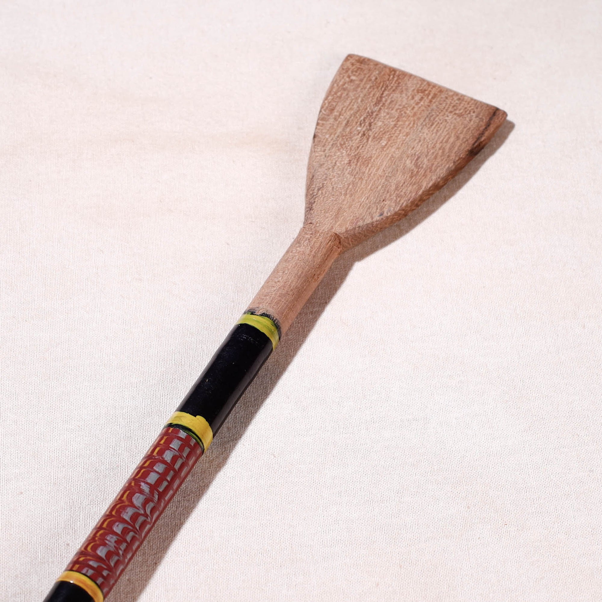 This exquisitely handcrafted cooking spatula is made of babool wood with lacquered colours. This spatula is meticulously handcrafted by skilled artisans from the Vadha community in villages like Nirona and Jura. They begin by selecting babool wood, which is known for its durability and strength. Layers of coloured lacquer are applied to the wood, and intricate designs and effects are chiselled to create a stunning visual appeal.