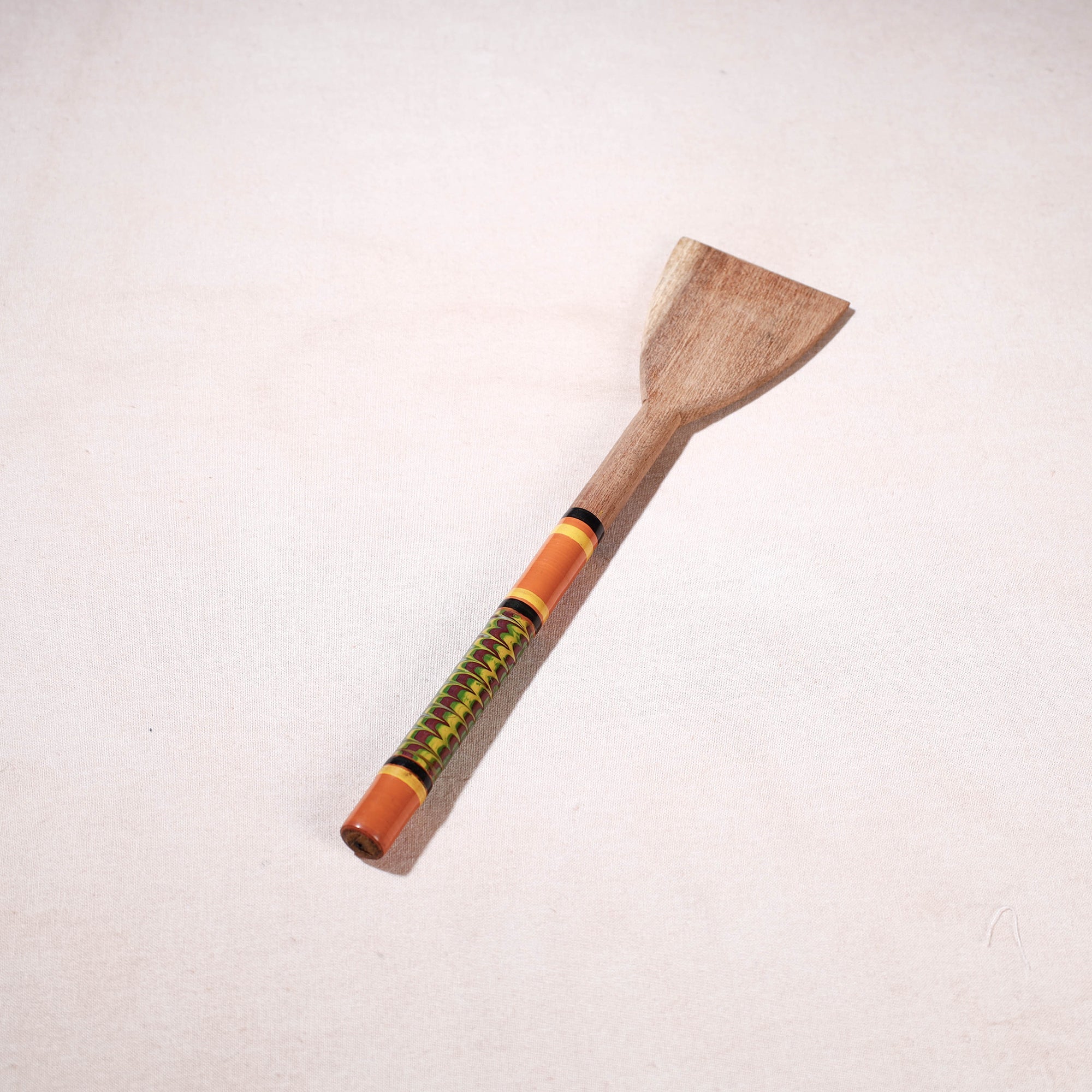 This exquisitely handcrafted cooking spatula is made of babool wood with lacquered colours. This spatula is meticulously handcrafted by skilled artisans from the Vadha community in villages like Nirona and Jura. They begin by selecting babool wood, which is known for its durability and strength. Layers of coloured lacquer are applied to the wood, and intricate designs and effects are chiselled to create a stunning visual appeal.