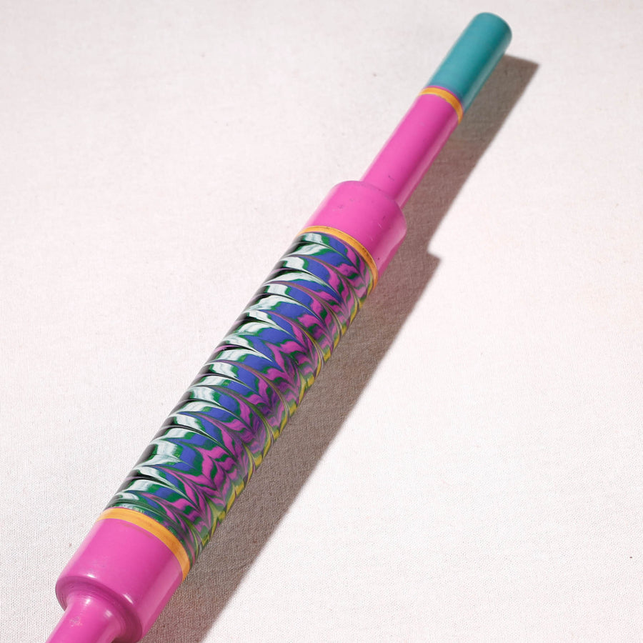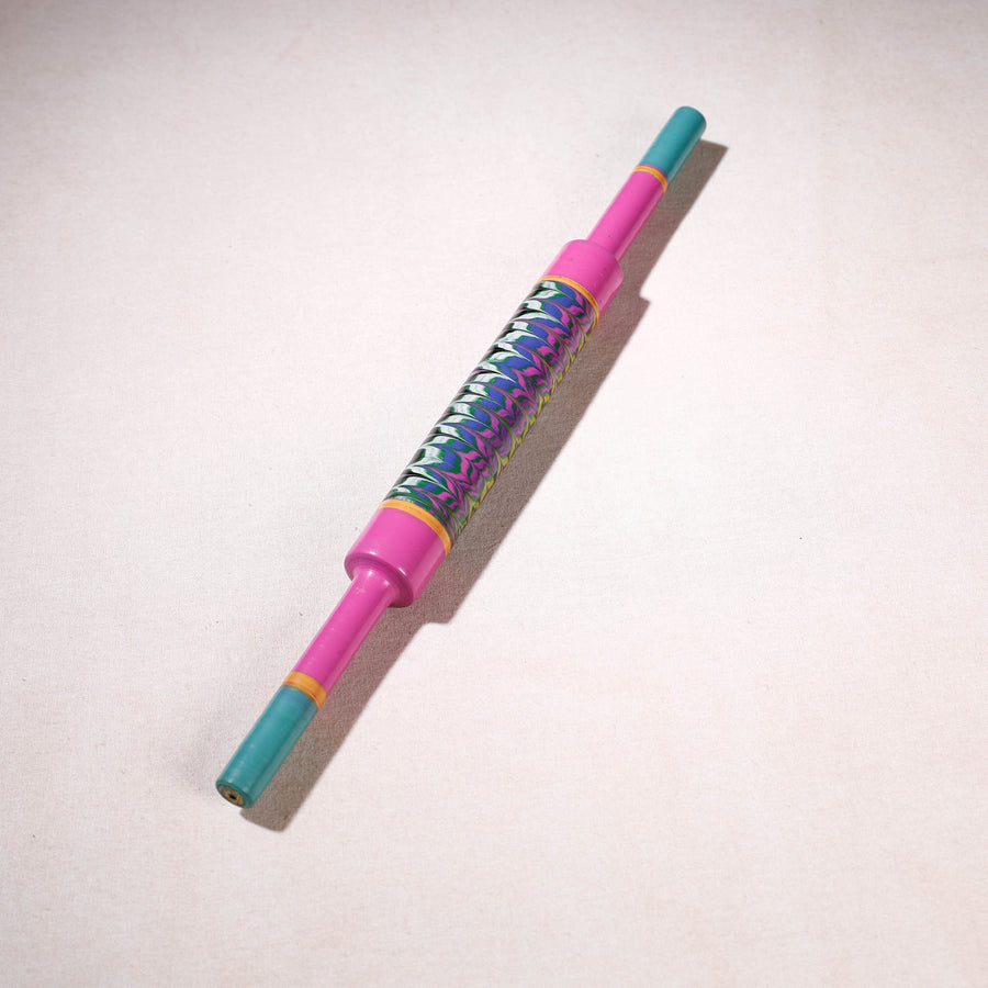 This exquisitely handcrafted belan/chapatti roller is made of babool wood with lacquered colours. This chapatti roller is meticulously handcrafted by skilled artisans from the Vadha community in villages like Nirona and Jura. They begin by selecting babool wood, which is known for its durability and strength. Layers of coloured lacquer are applied to the wood, and intricate designs and effects are chiselled to create a stunning visual appeal.