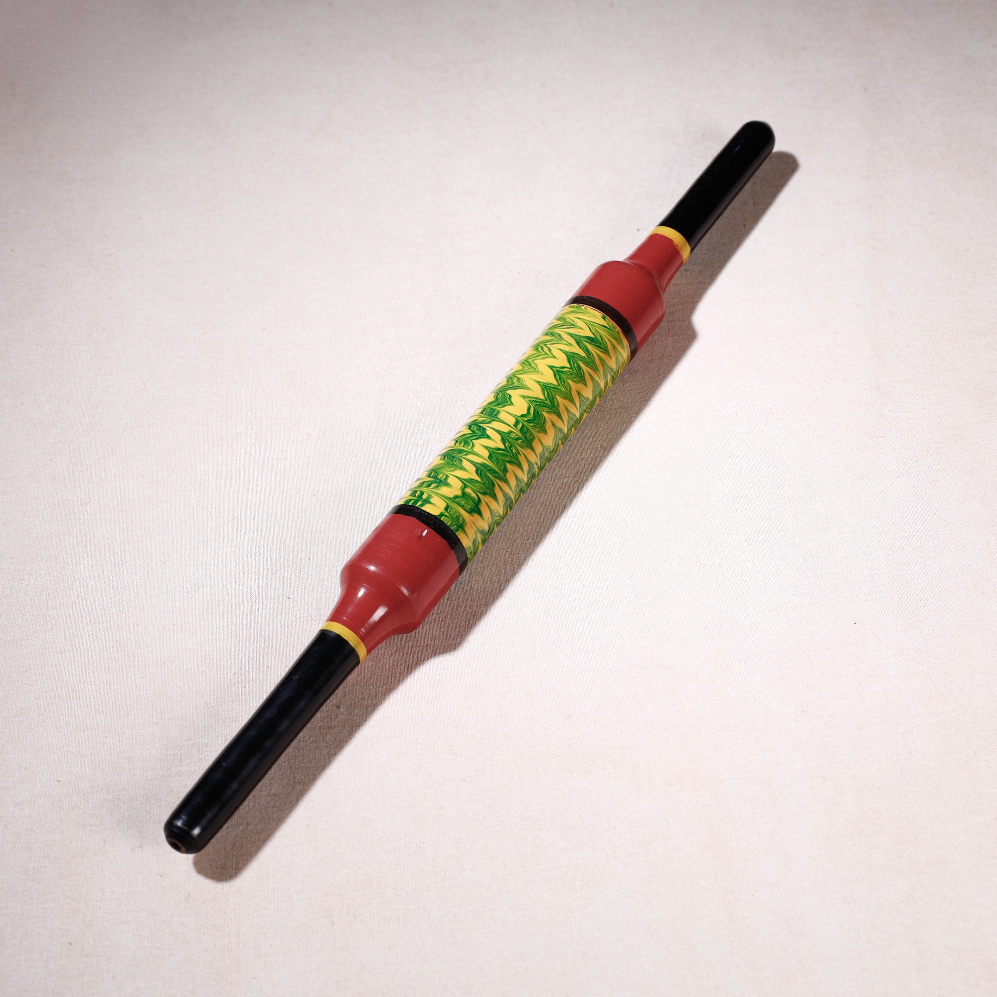 This exquisitely handcrafted belan/chapatti roller is made of babool wood with lacquered colours. This chapatti roller is meticulously handcrafted by skilled artisans from the Vadha community in villages like Nirona and Jura. They begin by selecting babool wood, which is known for its durability and strength. Layers of coloured lacquer are applied to the wood, and intricate designs and effects are chiselled to create a stunning visual appeal.