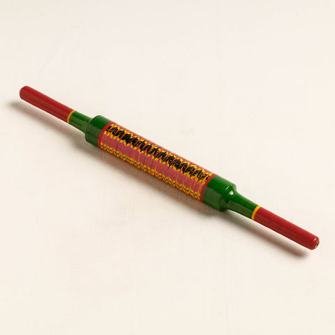 This exquisitely handcrafted belan/chapatti roller is made of babool wood with lacquered colours. This chapatti roller is meticulously handcrafted by skilled artisans from the Vadha community in villages like Nirona and Jura. They begin by selecting babool wood, which is known for its durability and strength. Layers of coloured lacquer are applied to the wood, and intricate designs and effects are chiselled to create a stunning visual appeal.