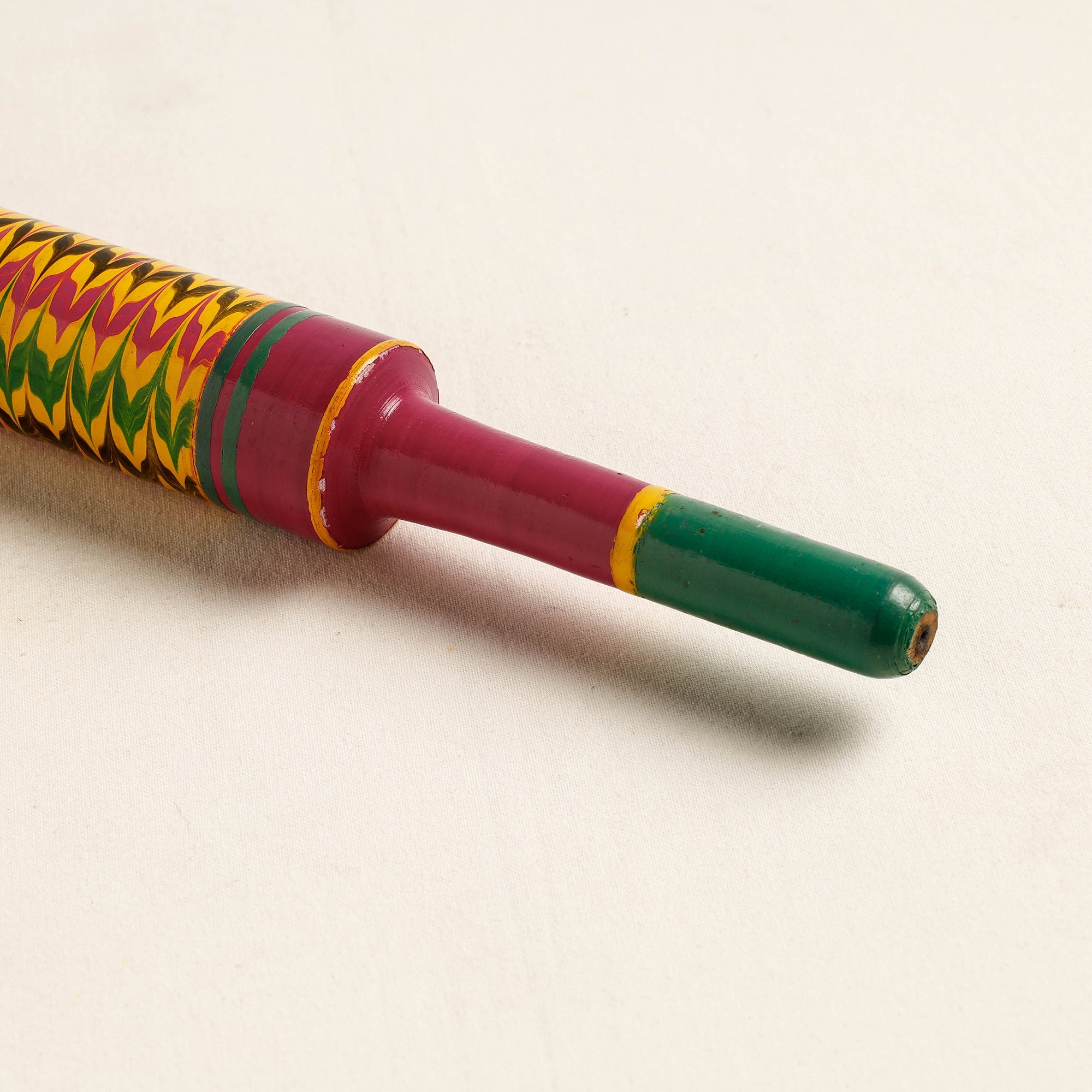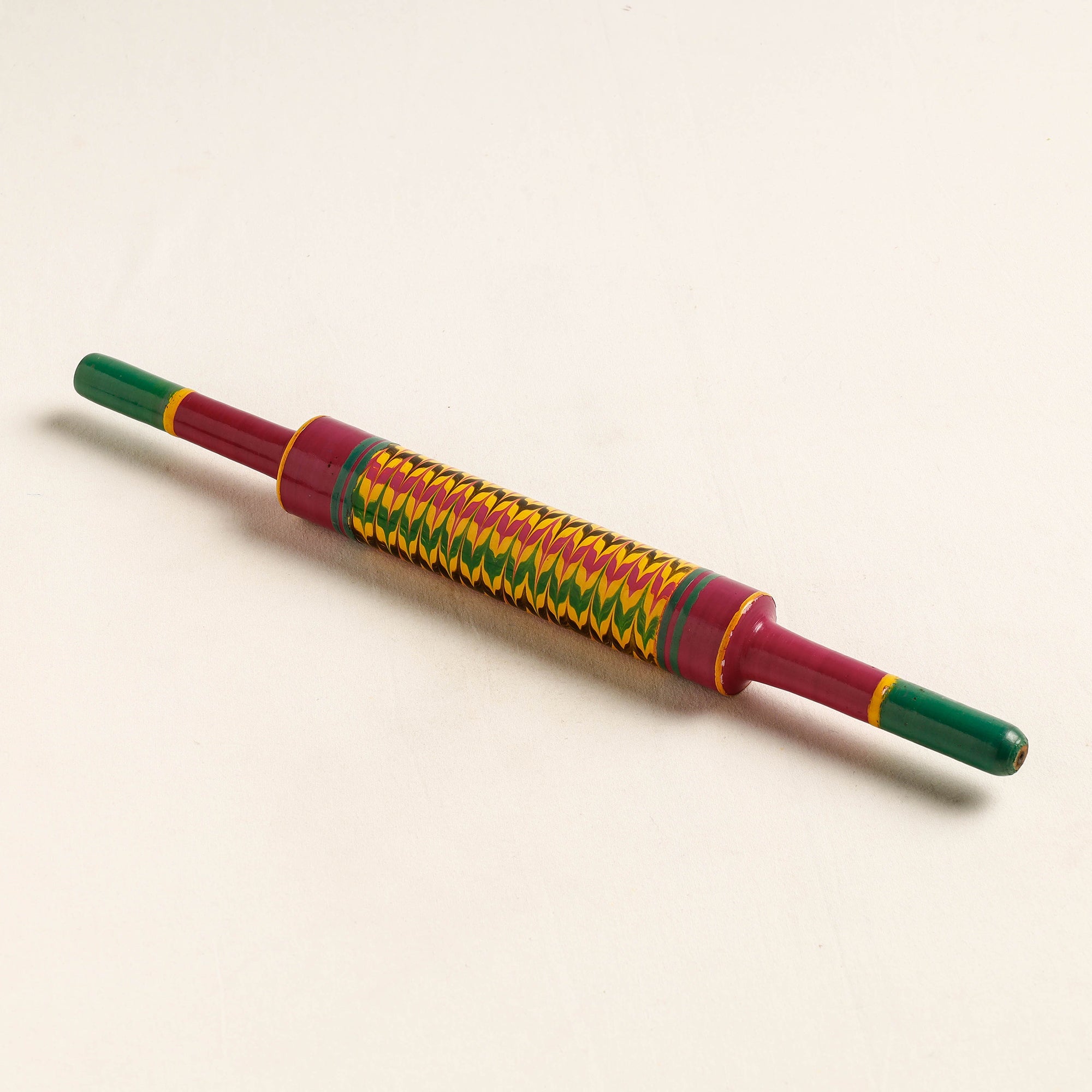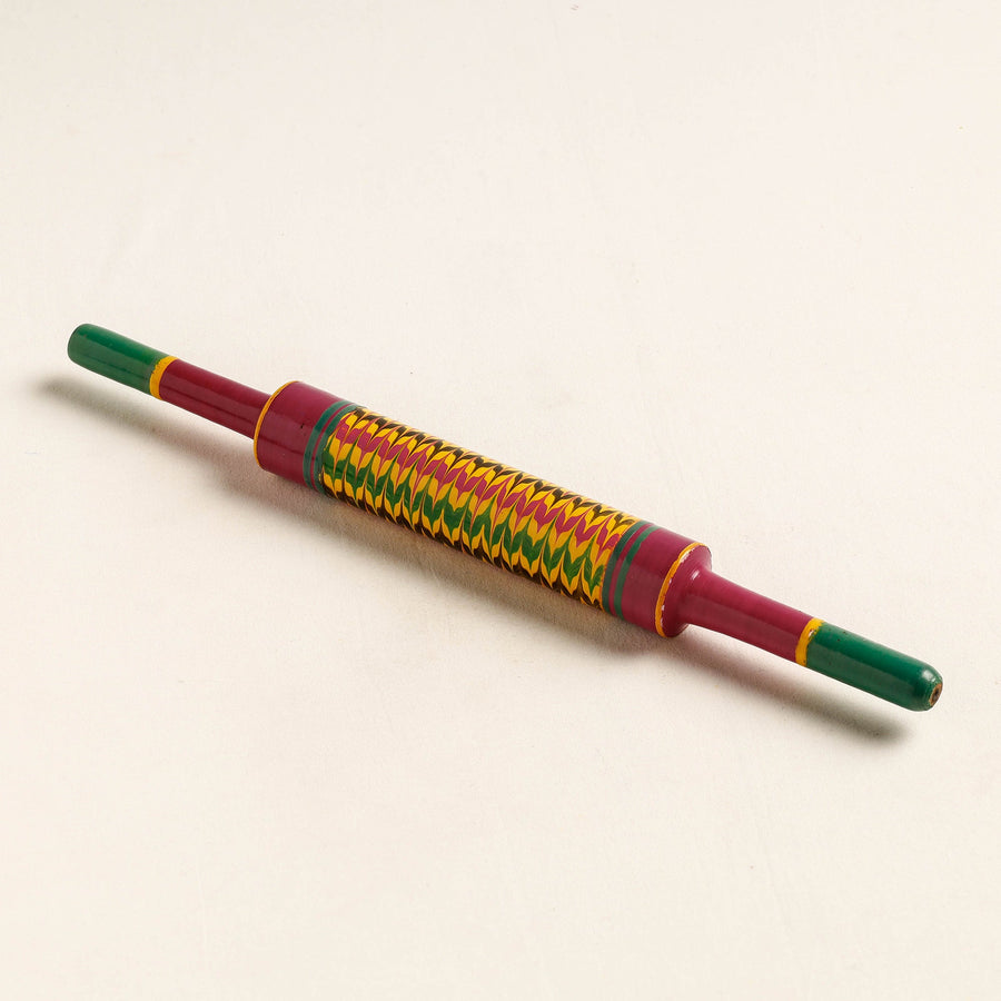 This exquisitely handcrafted belan/chapatti roller is made of babool wood with lacquered colours. This chapatti roller is meticulously handcrafted by skilled artisans from the Vadha community in villages like Nirona and Jura. They begin by selecting babool wood, which is known for its durability and strength. Layers of coloured lacquer are applied to the wood, and intricate designs and effects are chiselled to create a stunning visual appeal.