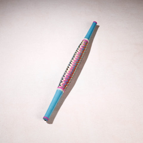 This exquisitely handcrafted belan/chapatti roller is made of babool wood with lacquered colours. This chapatti roller is meticulously handcrafted by skilled artisans from the Vadha community in villages like Nirona and Jura. They begin by selecting babool wood, which is known for its durability and strength. Layers of coloured lacquer are applied to the wood, and intricate designs and effects are chiselled to create a stunning visual appeal.