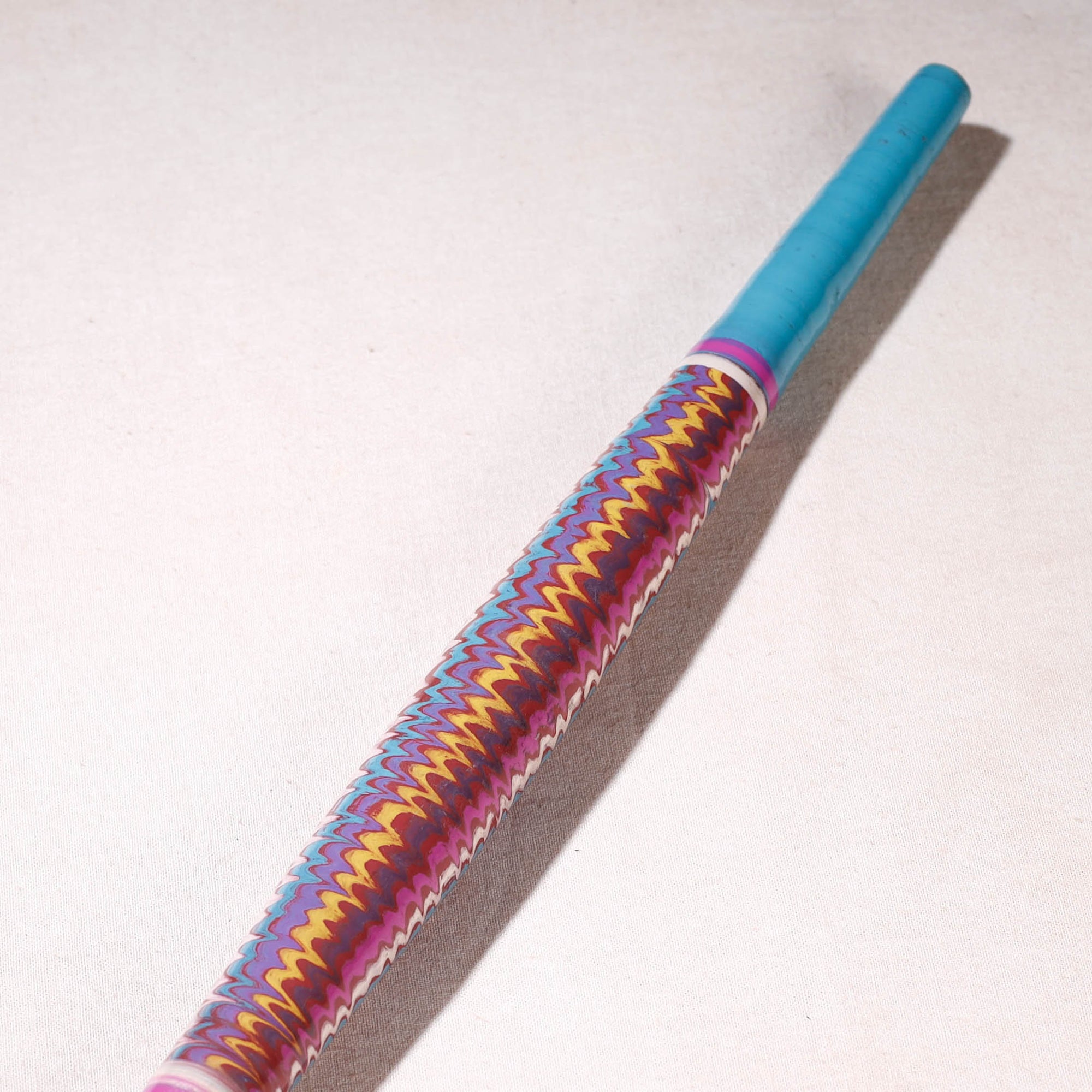 This exquisitely handcrafted belan/chapatti roller is made of babool wood with lacquered colours. This chapatti roller is meticulously handcrafted by skilled artisans from the Vadha community in villages like Nirona and Jura. They begin by selecting babool wood, which is known for its durability and strength. Layers of coloured lacquer are applied to the wood, and intricate designs and effects are chiselled to create a stunning visual appeal.