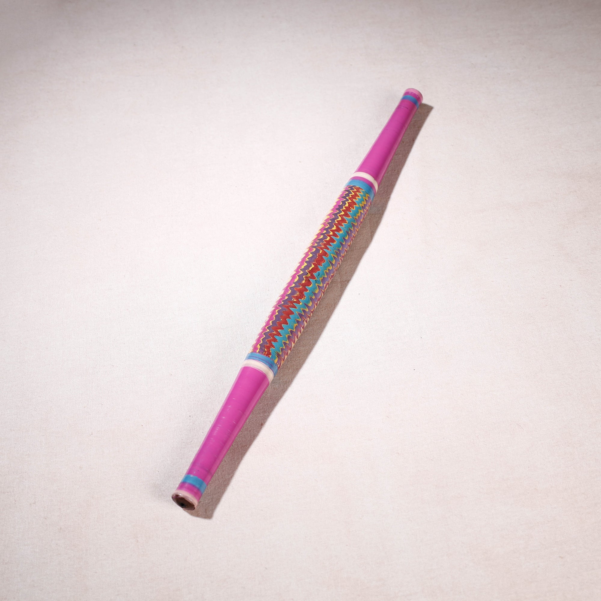 This exquisitely handcrafted belan/chapatti roller is made of babool wood with lacquered colours. This chapatti roller is meticulously handcrafted by skilled artisans from the Vadha community in villages like Nirona and Jura. They begin by selecting babool wood, which is known for its durability and strength. Layers of coloured lacquer are applied to the wood, and intricate designs and effects are chiselled to create a stunning visual appeal.