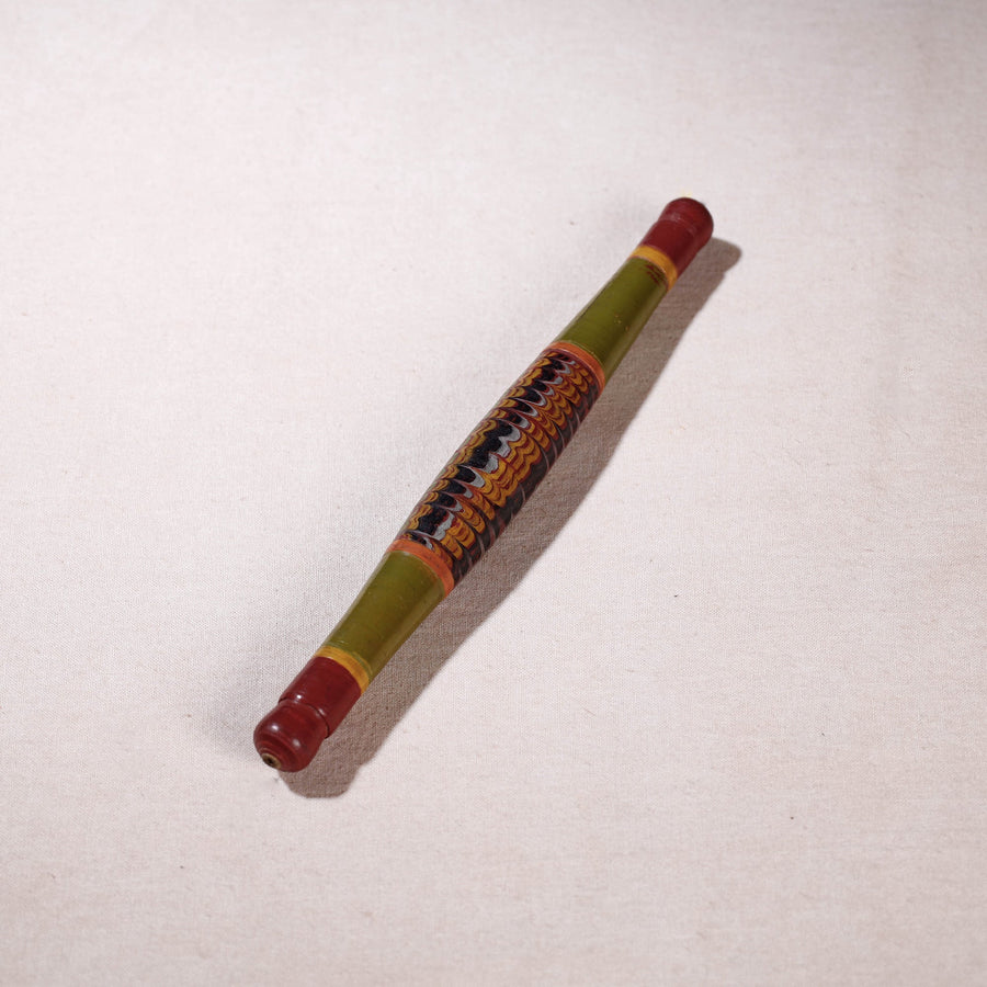 This exquisitely handcrafted belan/chapatti roller is made of babool wood with lacquered colours. This chapatti roller is meticulously handcrafted by skilled artisans from the Vadha community in villages like Nirona and Jura. They begin by selecting babool wood, which is known for its durability and strength. Layers of coloured lacquer are applied to the wood, and intricate designs and effects are chiselled to create a stunning visual appeal.