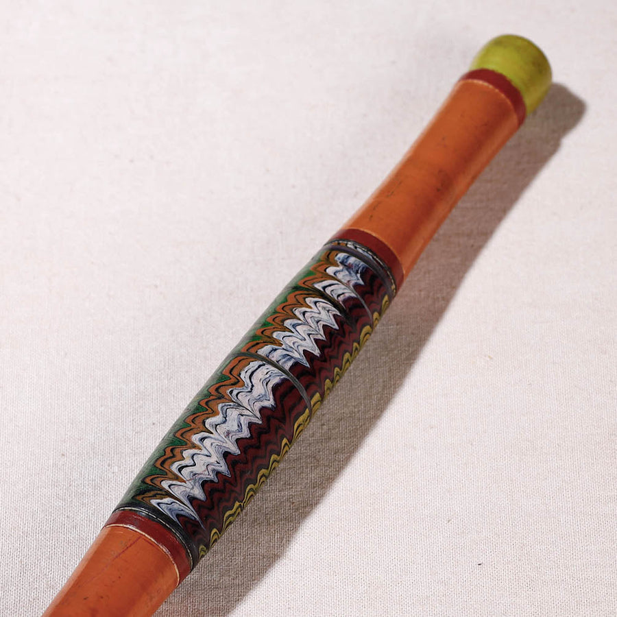 This exquisitely handcrafted belan/chapatti roller is made of babool wood with lacquered colours. This chapatti roller is meticulously handcrafted by skilled artisans from the Vadha community in villages like Nirona and Jura. They begin by selecting babool wood, which is known for its durability and strength. Layers of coloured lacquer are applied to the wood, and intricate designs and effects are chiselled to create a stunning visual appeal.
