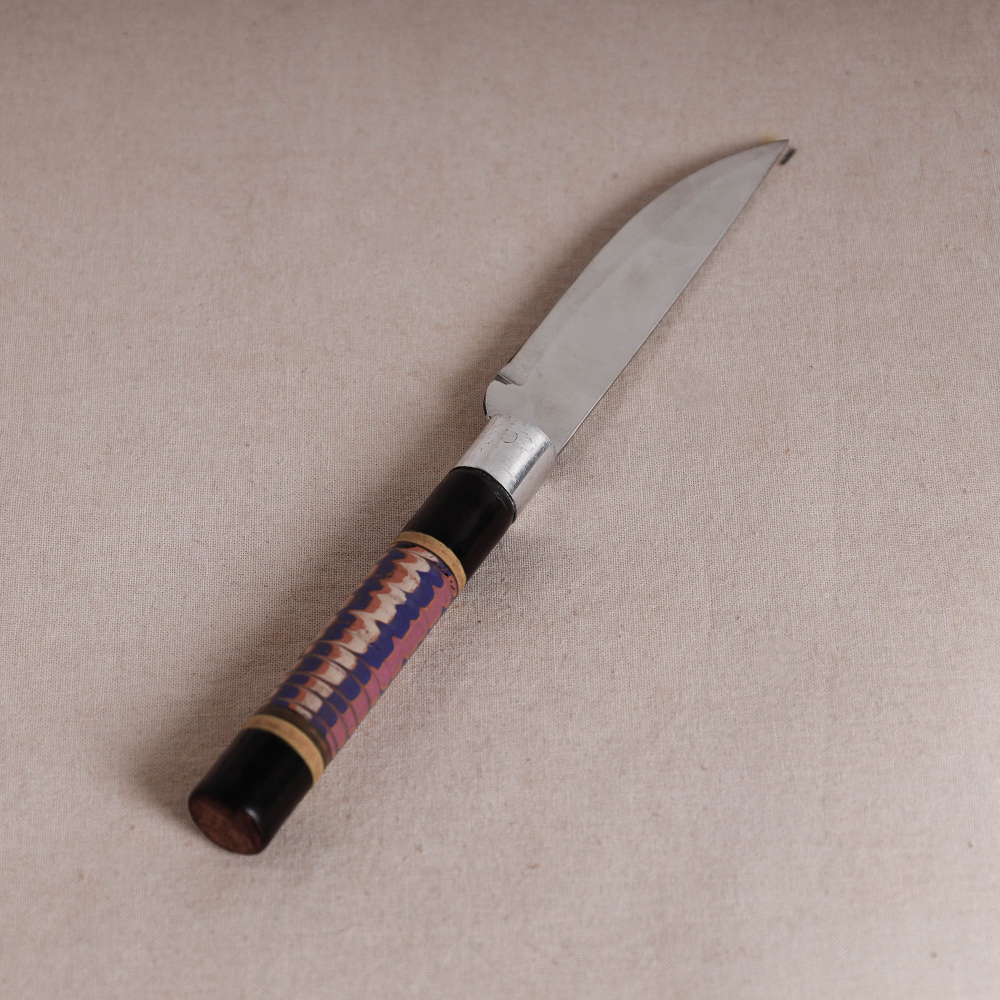 This exquisitely handcrafted utility knife is made of babool wood and stainless steel with lacquered colours. This utility knife is meticulously handcrafted by skilled artisans from the Vadha community in villages like Nirona and Jura. They begin by selecting babool wood, which is known for its durability and strength. Layers of coloured lacquer are applied to the wood, and intricate designs and effects are chiselled to create a stunning visual appeal.