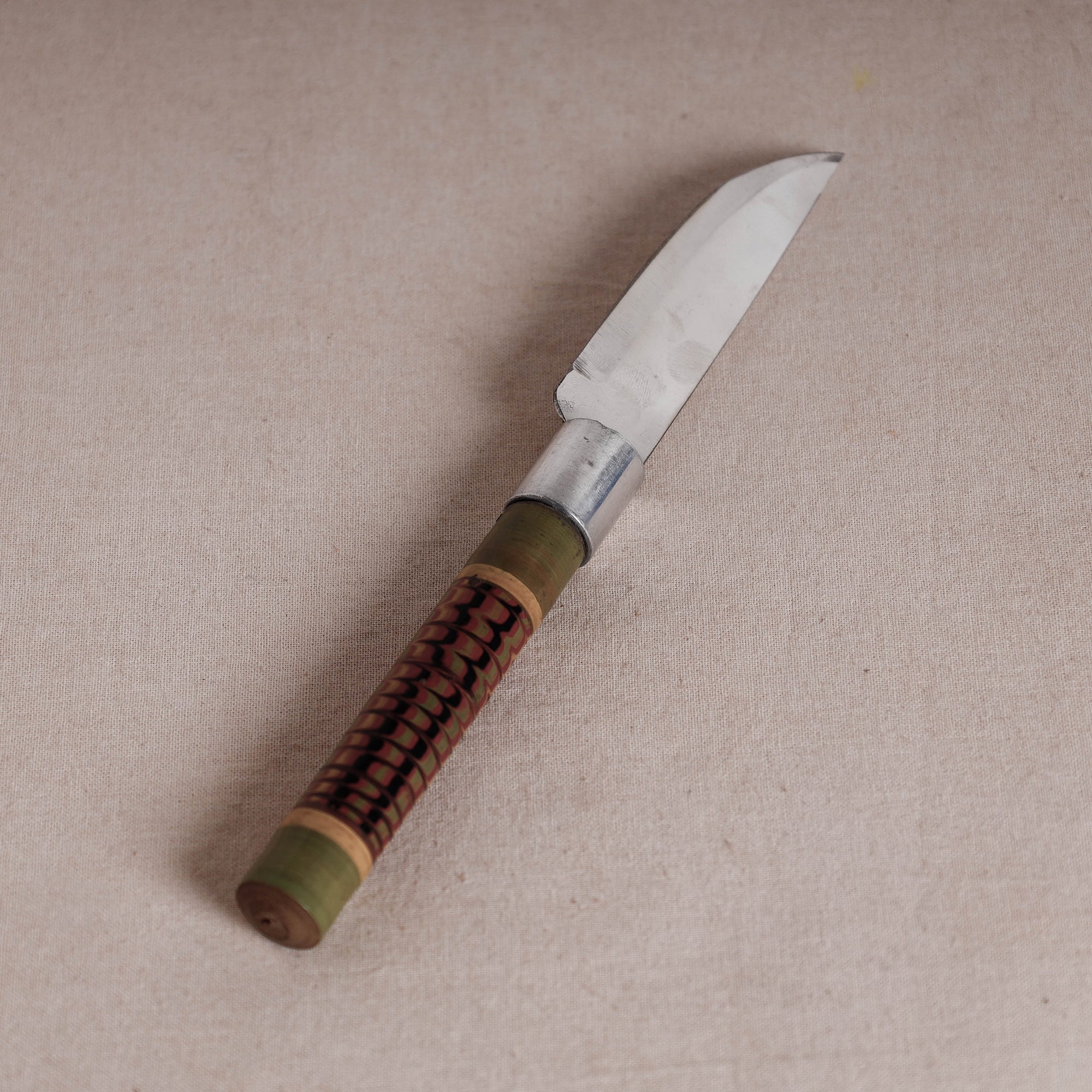 This exquisitely handcrafted utility knife is made of babool wood and stainless steel with lacquered colours. This utility knife is meticulously handcrafted by skilled artisans from the Vadha community in villages like Nirona and Jura. They begin by selecting babool wood, which is known for its durability and strength. Layers of coloured lacquer are applied to the wood, and intricate designs and effects are chiselled to create a stunning visual appeal.