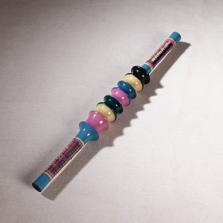This exquisitely handcrafted shakarpara roller is made of babool wood with lacquered colours. This shakarpara roller is meticulously handcrafted by skilled artisans from the Vadha community in villages like Nirona and Jura. They begin by selecting babool wood, which is known for its durability and strength. Layers of coloured lacquer are applied to the wood, and intricate designs and effects are chiselled to create a stunning visual appeal.