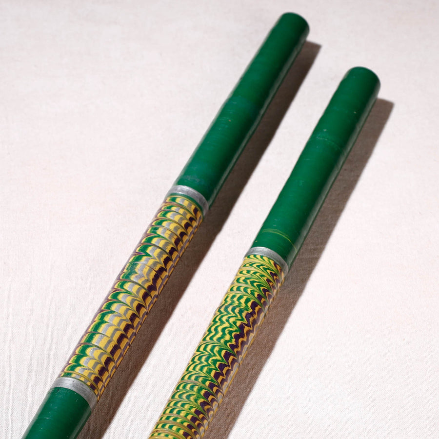 These exquisitely handcrafted garba dandiya sticks are made of babool wood with lacquered colours. These garba dandiya sticks are meticulously handcrafted by skilled artisans from the Vadha community in villages like Nirona and Jura. They begin by selecting babool wood, which is known for its durability and strength. Layers of coloured lacquer are applied to the wood, and intricate designs and effects are chiselled to create a stunning visual appeal.