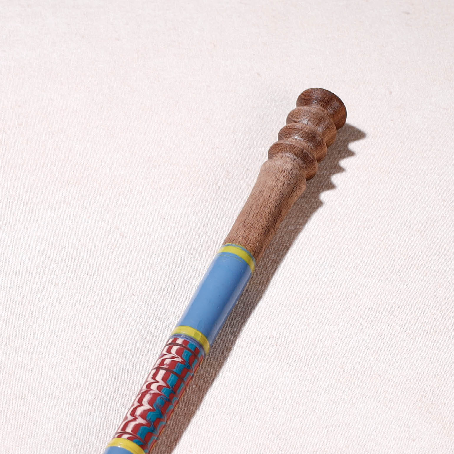 This exquisite handcrafted honey serving spoon is made of babool wood with lacquered colours. This spoon is meticulously handcrafted by skilled artisans from the Vadha community in villages like Nirona and Jura. They begin by selecting babool wood, which is known for its durability and strength. Layers of coloured lacquer are applied to the wood, and intricate designs and effects are chiselled to create a stunning visual appeal.