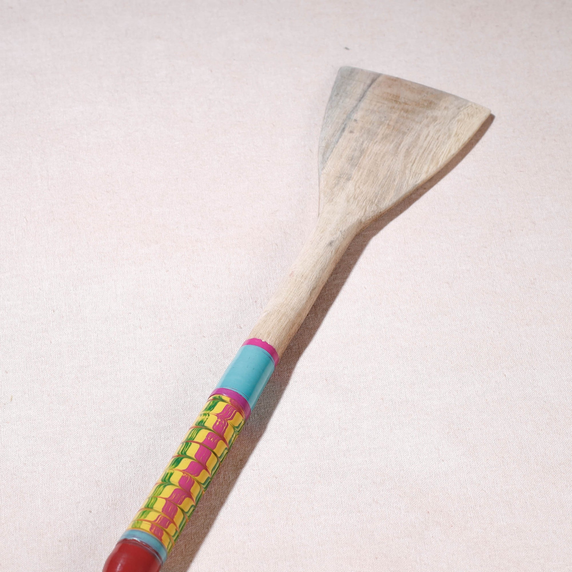 This exquisitely handcrafted cooking spatula is made of babool wood with lacquered colours. This spatula is meticulously handcrafted by skilled artisans from the Vadha community in villages like Nirona and Jura. They begin by selecting babool wood, which is known for its durability and strength. Layers of coloured lacquer are applied to the wood, and intricate designs and effects are chiselled to create a stunning visual appeal.