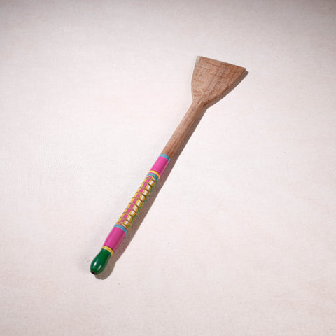This exquisitely handcrafted cooking spatula is made of babool wood with lacquered colours. This spatula is meticulously handcrafted by skilled artisans from the Vadha community in villages like Nirona and Jura. They begin by selecting babool wood, which is known for its durability and strength. Layers of coloured lacquer are applied to the wood, and intricate designs and effects are chiselled to create a stunning visual appeal.