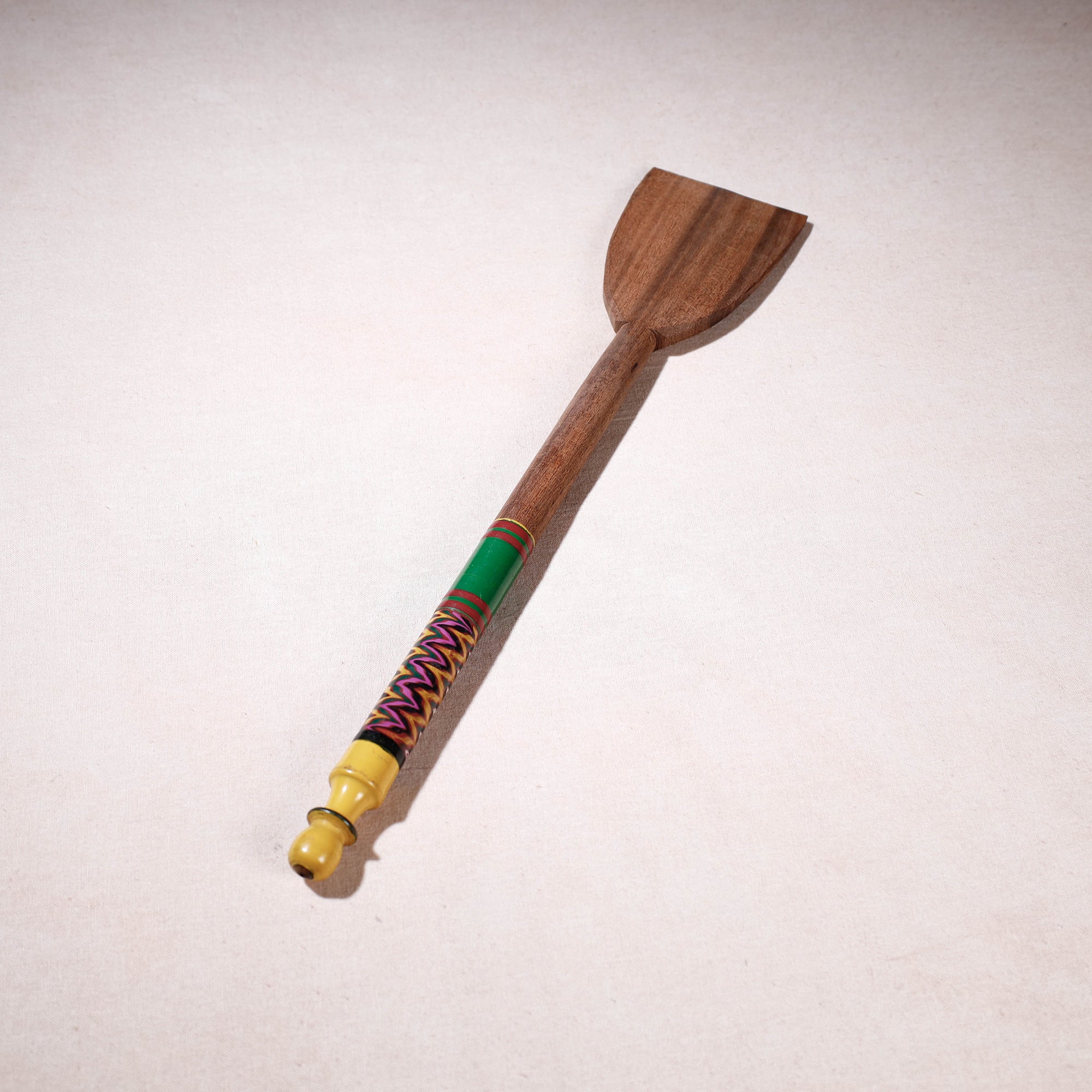 This exquisitely handcrafted cooking spatula is made of babool wood with lacquered colours. This spatula is meticulously handcrafted by skilled artisans from the Vadha community in villages like Nirona and Jura. They begin by selecting babool wood, which is known for its durability and strength. Layers of coloured lacquer are applied to the wood, and intricate designs and effects are chiselled to create a stunning visual appeal.
