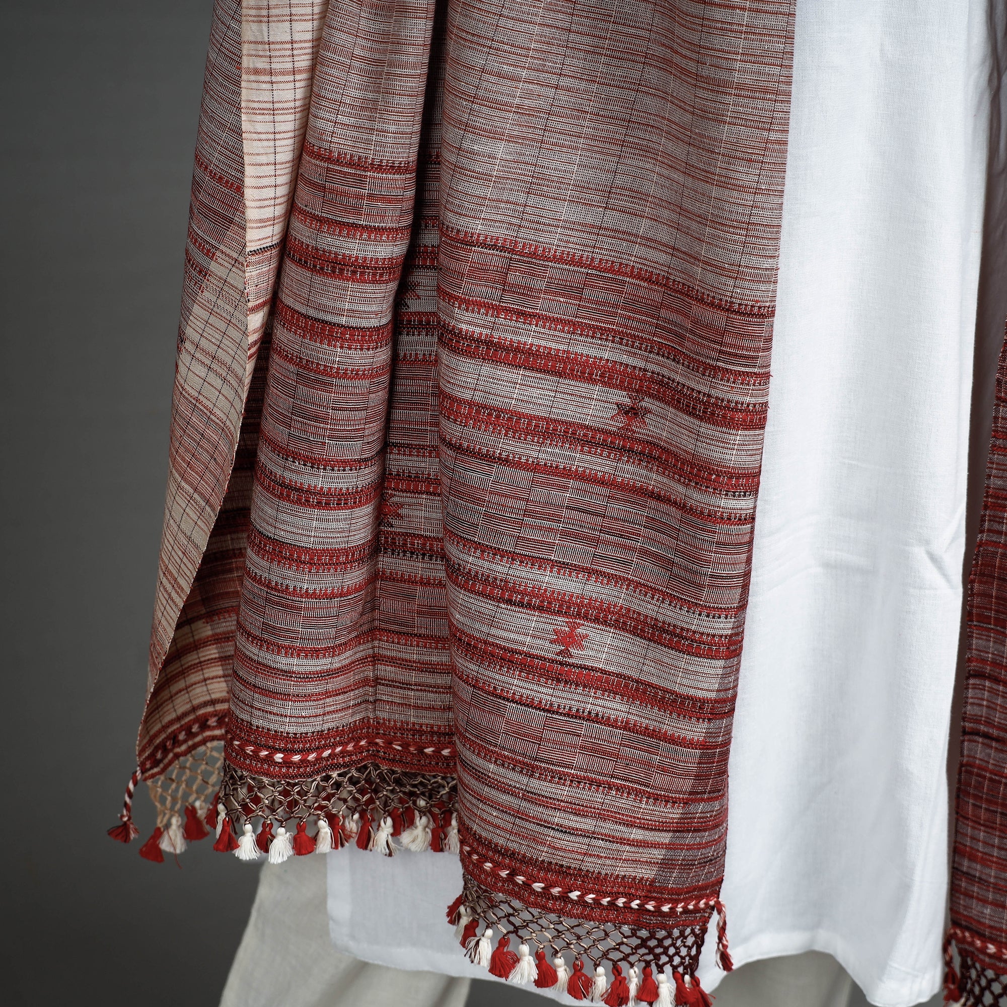 Fine quality kutch bhujodi weaving handloom fine cotton dupatta with tassels by Vinay Siju. This dupatta is crafted using cotton fibers. The kutch bhujodi weaving technique is employed to create this exquisite dupatta. Skilled artisans from the village of Bhujodi in Kutch meticulously handloom this textile using traditional weaving methods. The intricate weaving process results in a stunning pattern that showcases the artistry and expertise of the weavers.