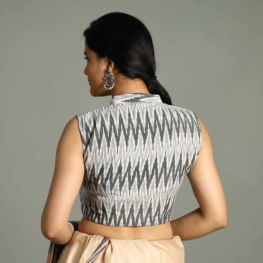 This pochampally ikat cotton stitched sleeveless blouse is crafted with fine quality cotton fabric, ensuring comfort and breathability throughout the day. It features a stylish chinese collar that adds a touch of sophistication to your outfit. It is adorned with wooden button locks, adding a natural and rustic element to the design. The sleeveless style offers freedom of movement and a modern look. With its traditional pochampally ikat design, this blouse adds a touch of cultural charm to your outfit.