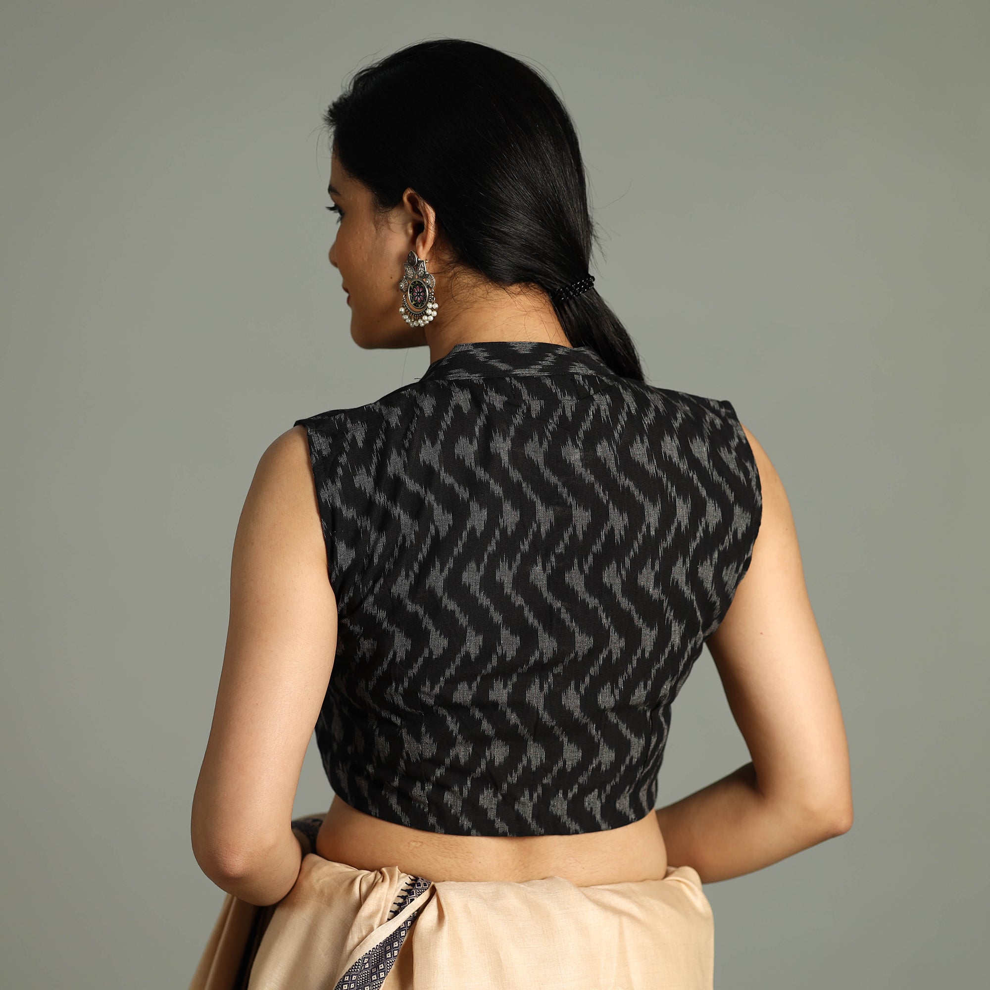 This pochampally ikat cotton stitched sleeveless blouse is crafted with fine quality cotton fabric, ensuring comfort and breathability throughout the day. It features a stylish chinese collar that adds a touch of sophistication to your outfit. It is adorned with wooden button locks, adding a natural and rustic element to the design. The sleeveless style offers freedom of movement and a modern look. With its traditional pochampally ikat design, this blouse adds a touch of cultural charm to your outfit.