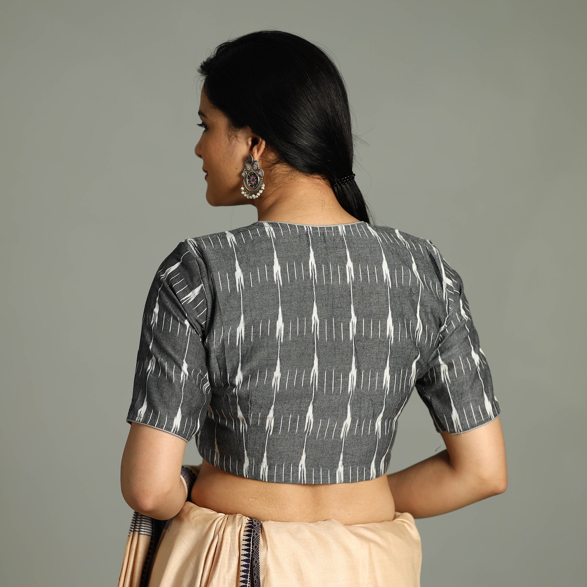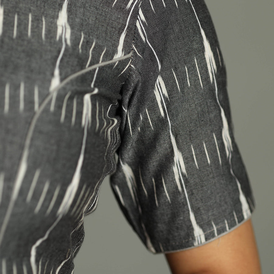 This pochampally ikat cotton stitched blouse is crafted with fine quality cotton fabric, ensuring comfort and breathability throughout the day. It features elegant half sleeves that provide balanced coverage, making it perfect for any occasion. The hook lock adds convenience and allows for easy wear and removal. With its traditional pochampally ikat design, this blouse adds a touch of cultural charm to your outfit.