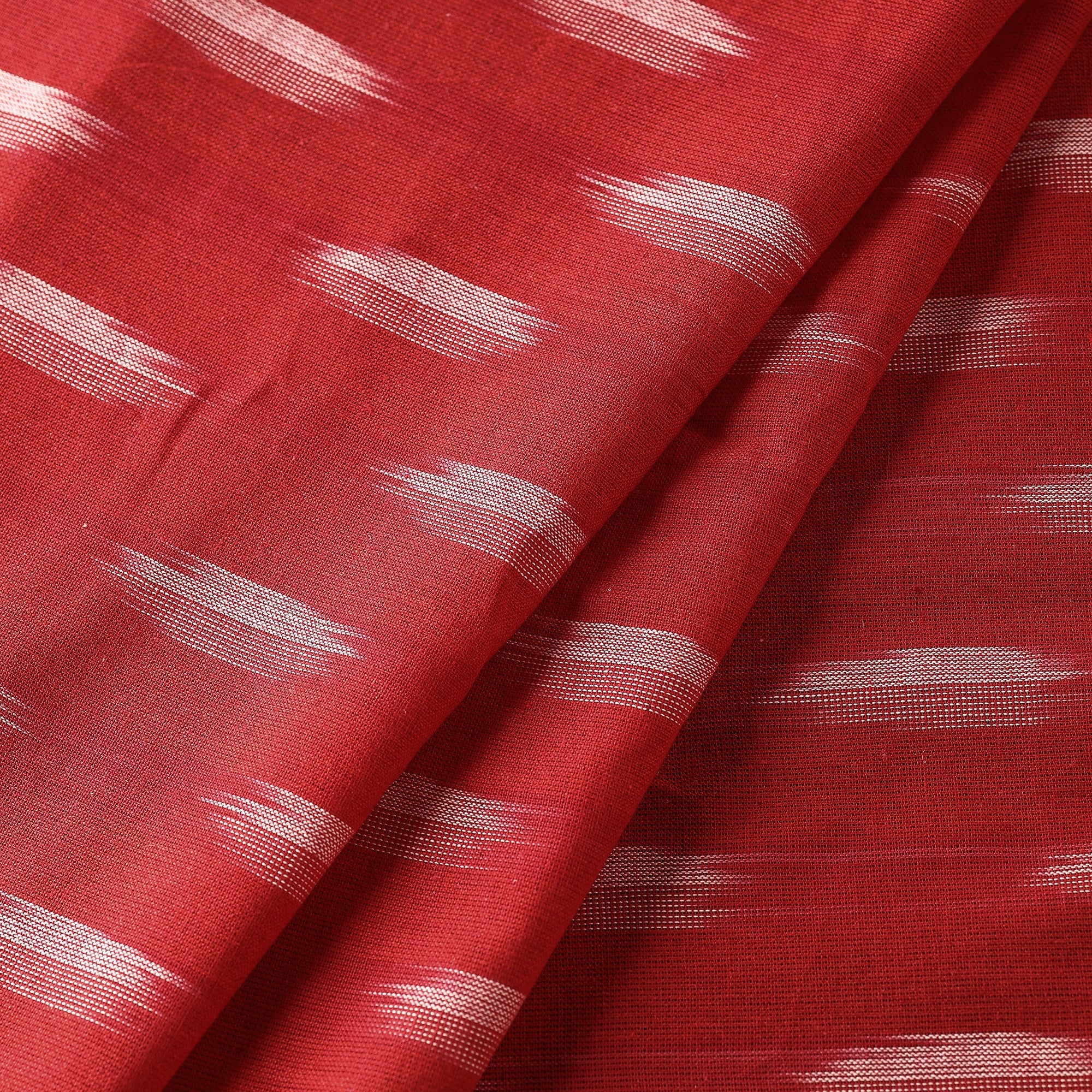 Fine quality feather shaped butta on red pochampally ikat weave cotton fabric from Koyyalagudem Village in Andhra Pradesh. Ikat (Ikkat) is a dyeing technique used to pattern textiles that employs a resist dyeing process similar to tie-dye on either the warp or weft fibers prior to dyeing. Ikat has lovely patterns and are world famous for their extremely beautiful colors, texture and designs. Indian Ikat is always admired by the fashion designers around the world.