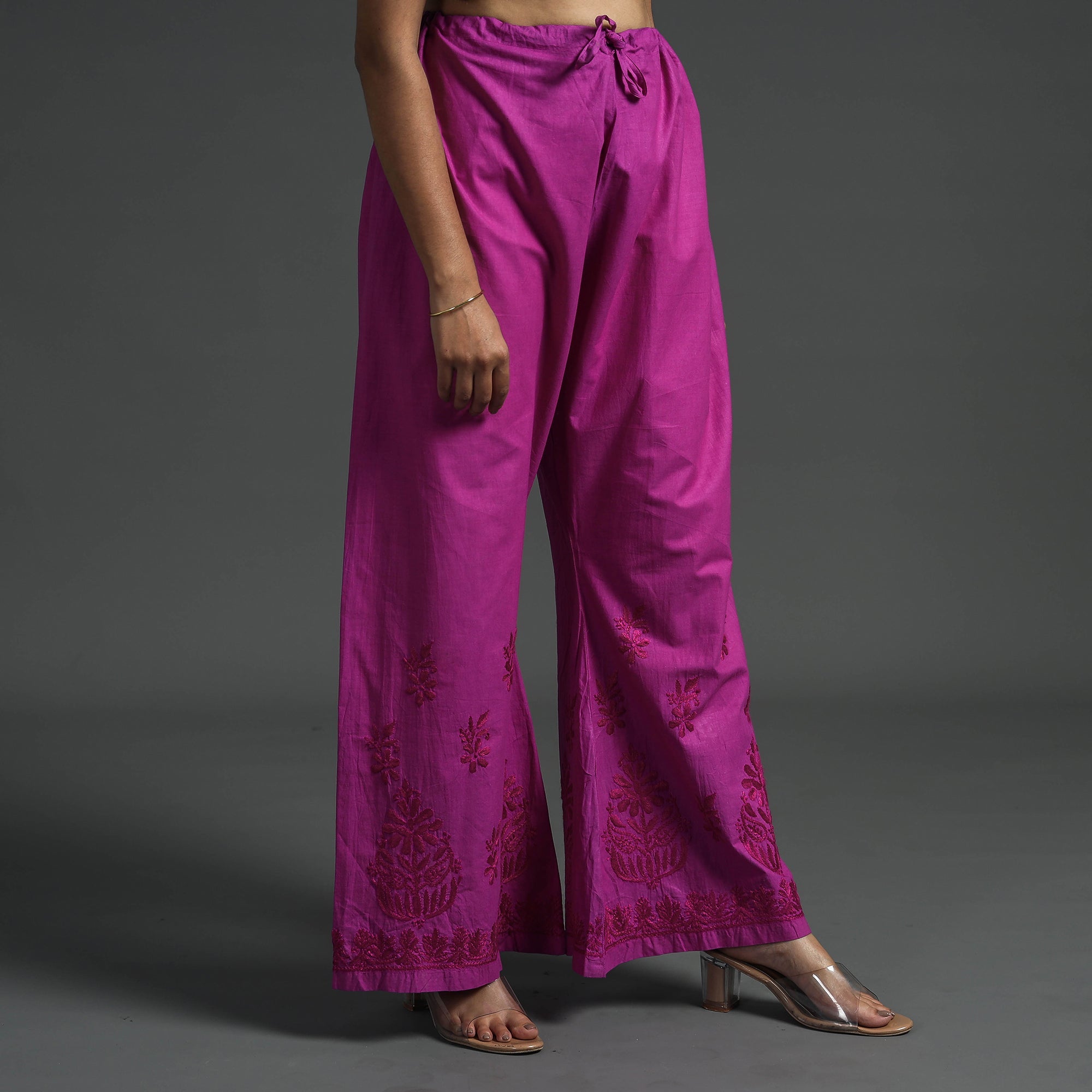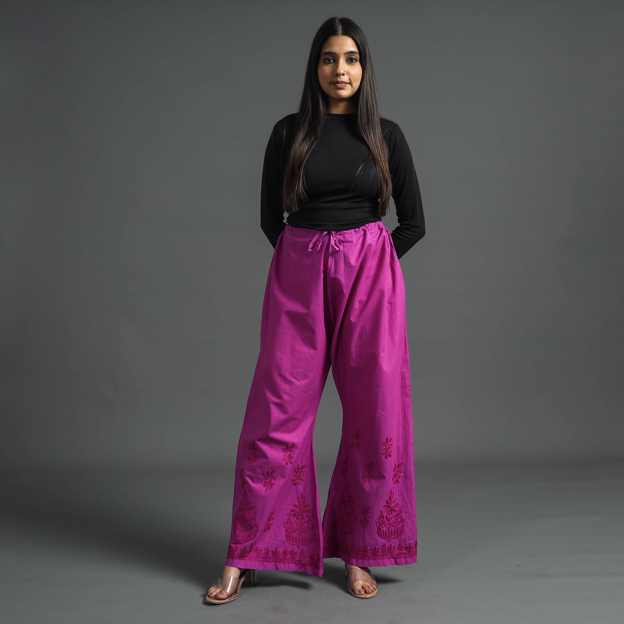 Intricate and artfully done lucknowi chikankari hand embroidery cotton palazzo. Chikankari is a traditional textile decorative from Lucknow. It is very delicate and intricate hand embroidery work where thread is embroidered on cool, pastel shades of light cotton garments.