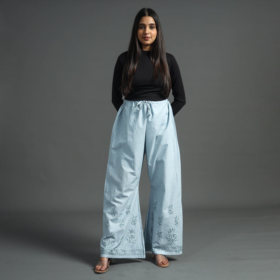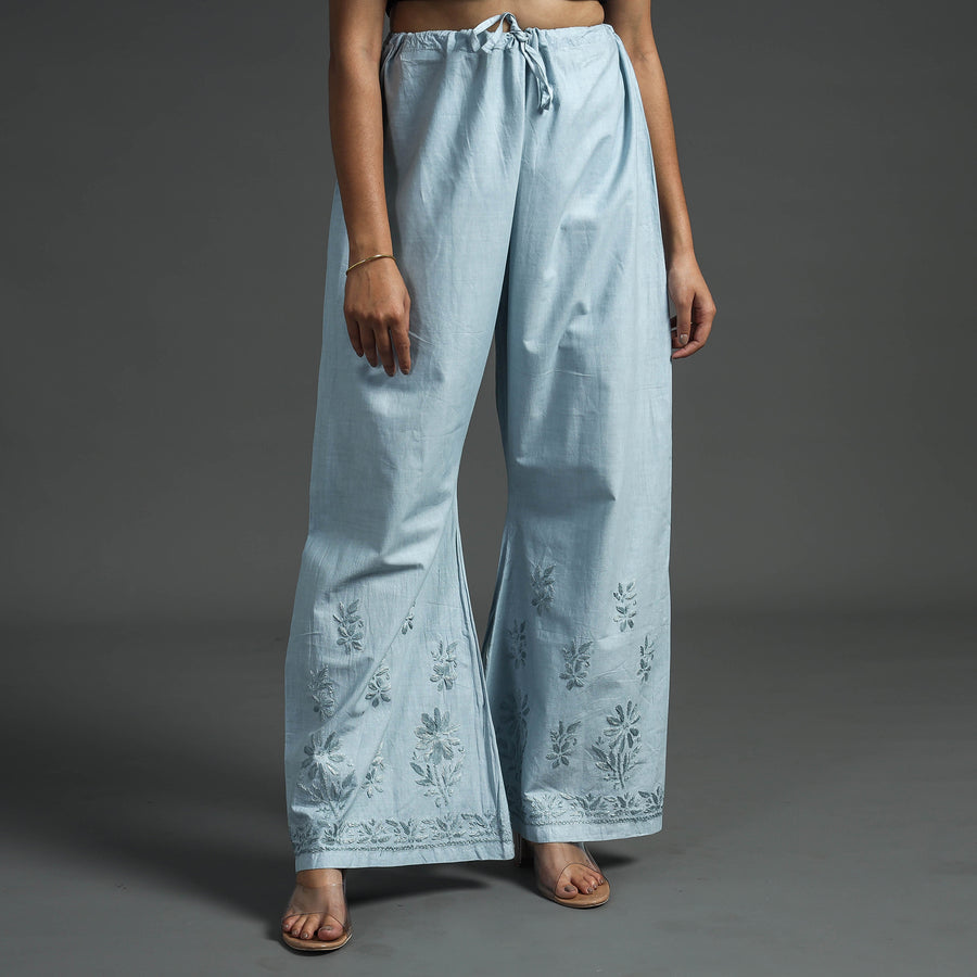 Intricate and artfully done lucknowi chikankari hand embroidery cotton palazzo. Chikankari is a traditional textile decorative from Lucknow. It is very delicate and intricate hand embroidery work where thread is embroidered on cool, pastel shades of light cotton garments.