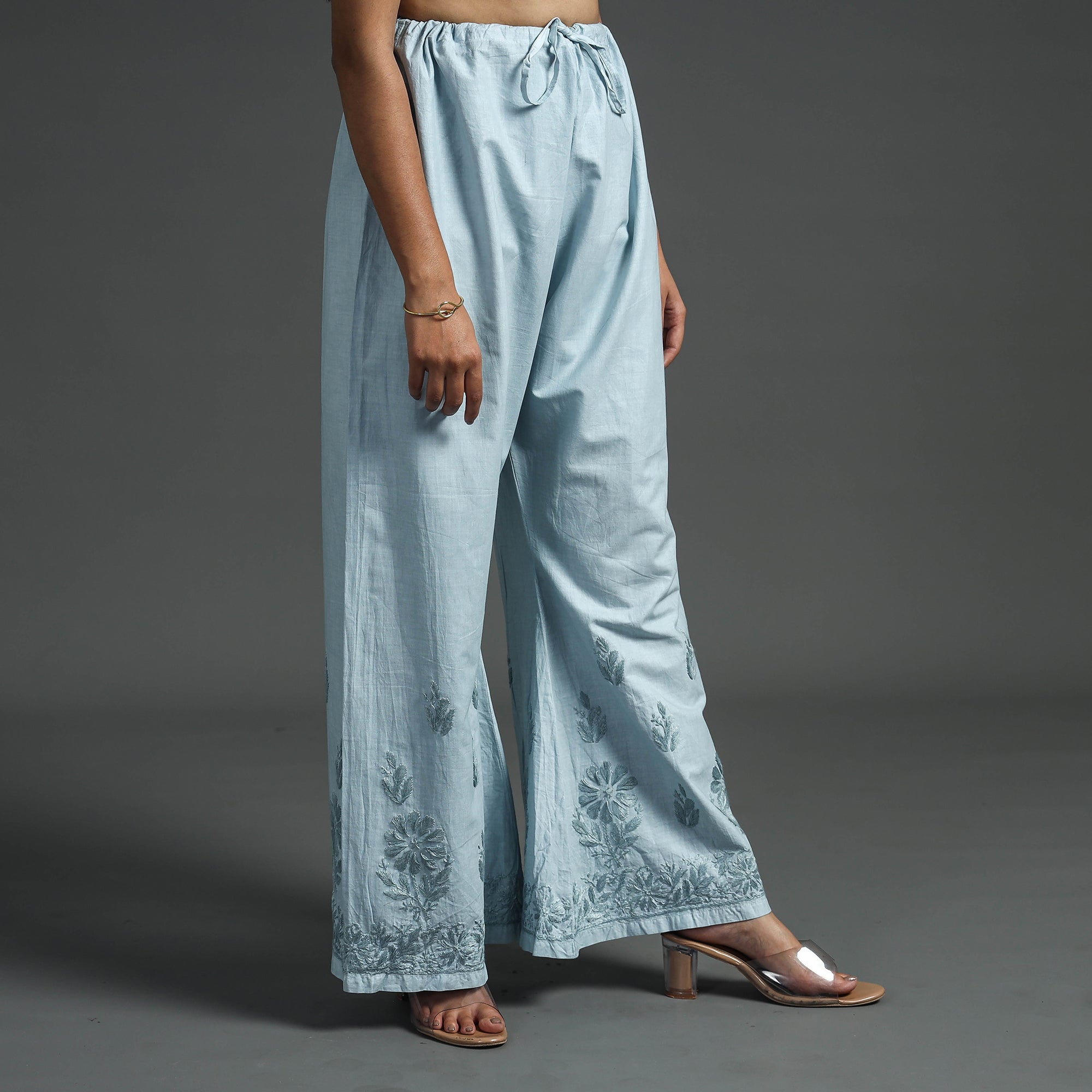Intricate and artfully done lucknowi chikankari hand embroidery cotton palazzo. Chikankari is a traditional textile decorative from Lucknow. It is very delicate and intricate hand embroidery work where thread is embroidered on cool, pastel shades of light cotton garments.