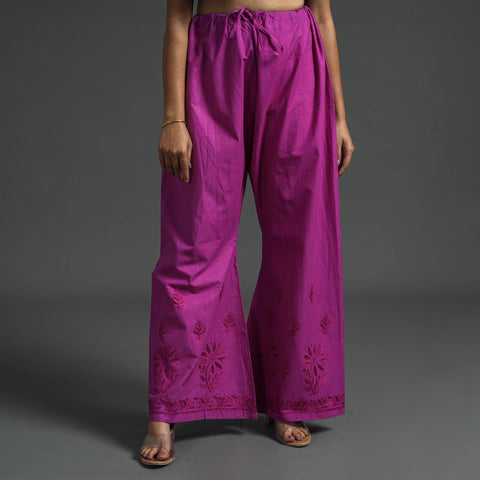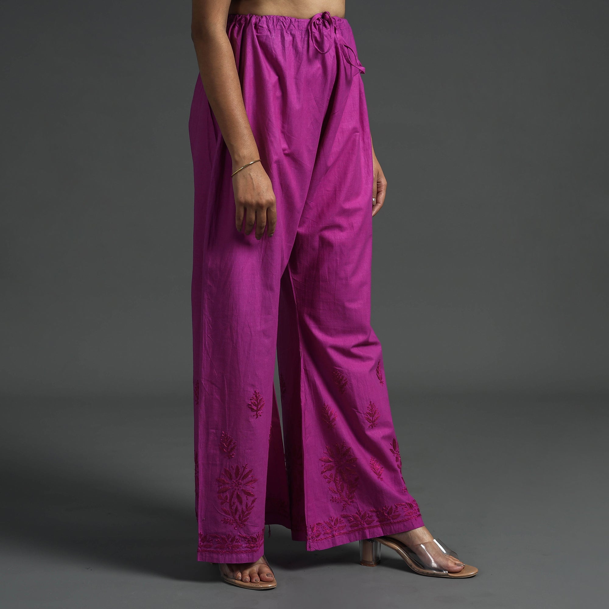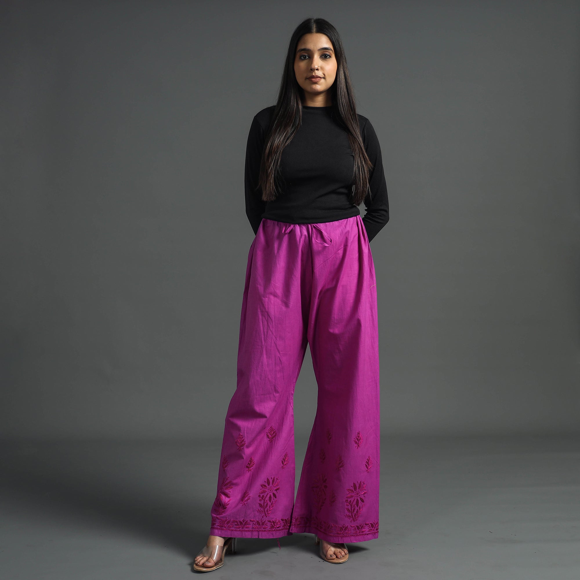 Intricate and artfully done lucknowi chikankari hand embroidery cotton palazzo. Chikankari is a traditional textile decorative from Lucknow. It is very delicate and intricate hand embroidery work where thread is embroidered on cool, pastel shades of light cotton garments.