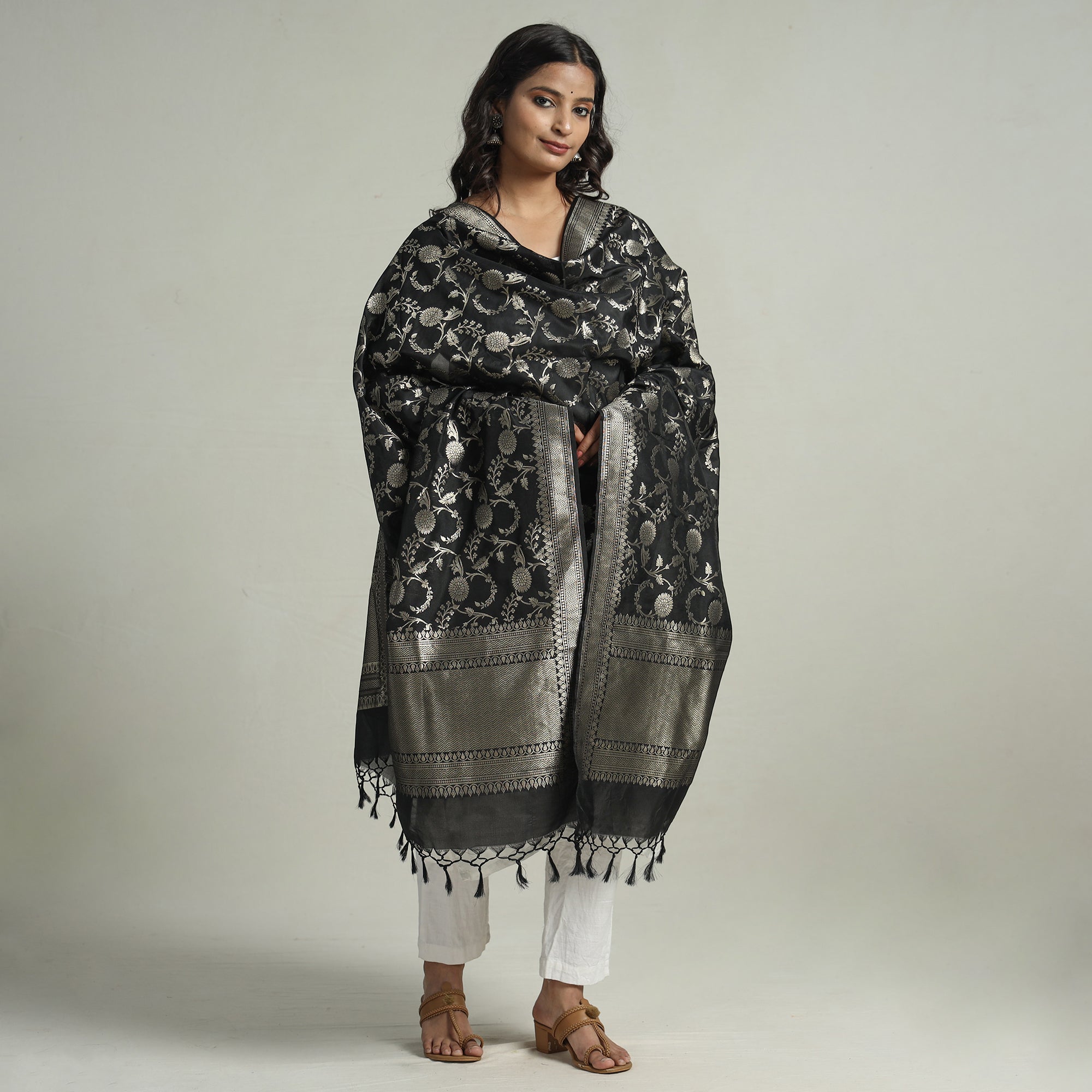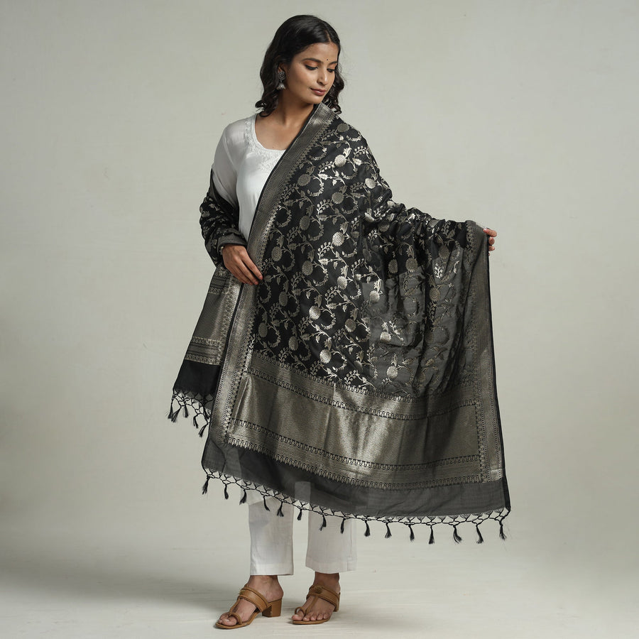 Black - Banarasi Semi Silk Zari Jaal Dupatta with Tassels 71