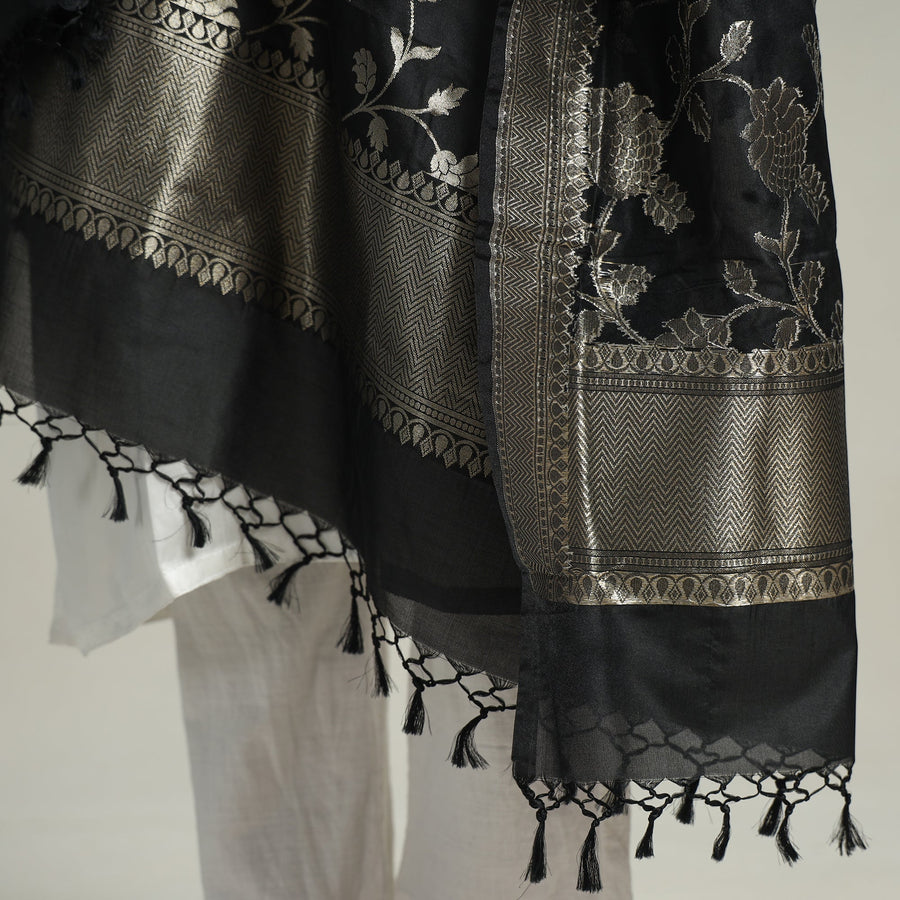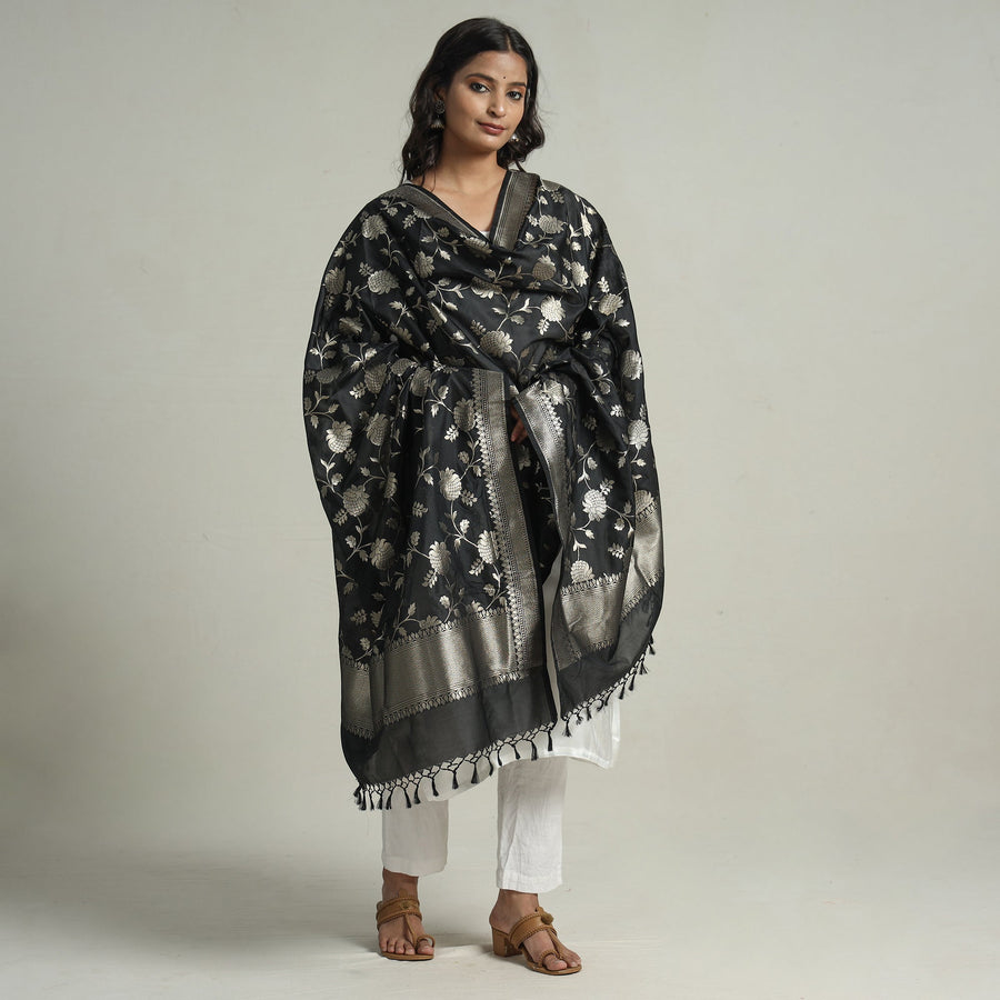 This exquisite banarasi semi silk zari jaal dupatta with tassels is a stunning addition to your wardrobe. The intricate floral zari jaal pattern adds a touch of elegance and grace to the rich dupatta. Adorned with delicate tassels, this dupatta is the perfect accessory to elevate your traditional attire. Its lightweight and semi-silk texture ensure comfort while exuding a regal charm. With its blend of traditional and contemporary style, this dupatta is a must-have accessory for a glamorous look.
