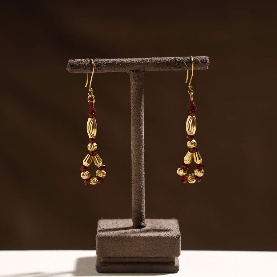 Yellow handcrafted brass metal alloy dokra beads & threadwork earrings handmade by tribes. Dokra system of metal casting is said to be the oldest form of metal casting and is technically known as ‘cire perdue’ or lost wax process. The technique of casting revolves round replacement of wax with molten metal by the traditional hollow casting method. Very intense process of Dhokra casting is currently practiced in tribal areas of India mostly around Chhattisgarh and Orissa.