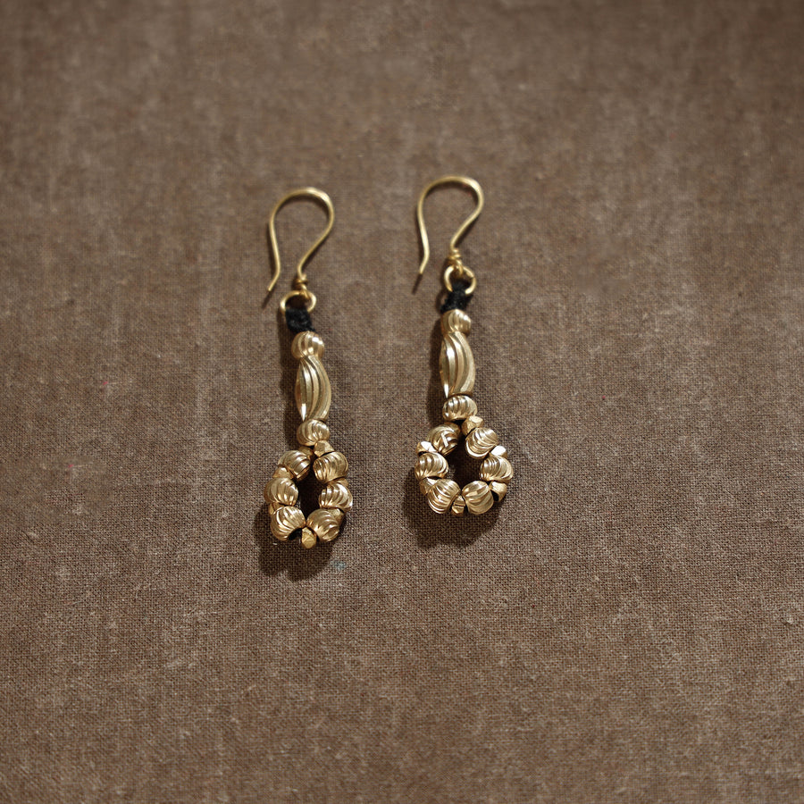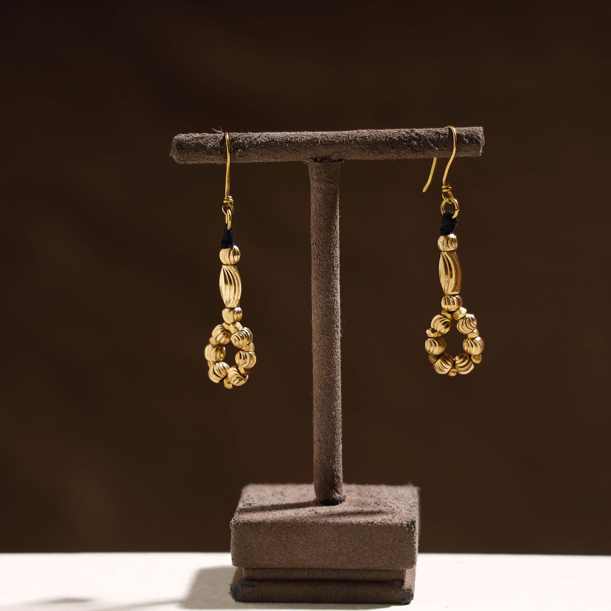 Yellow handcrafted brass metal alloy dokra beads & threadwork earrings handmade by tribes. Dokra system of metal casting is said to be the oldest form of metal casting and is technically known as ‘cire perdue’ or lost wax process. The technique of casting revolves round replacement of wax with molten metal by the traditional hollow casting method. Very intense process of Dhokra casting is currently practiced in tribal areas of India mostly around Chhattisgarh and Orissa.