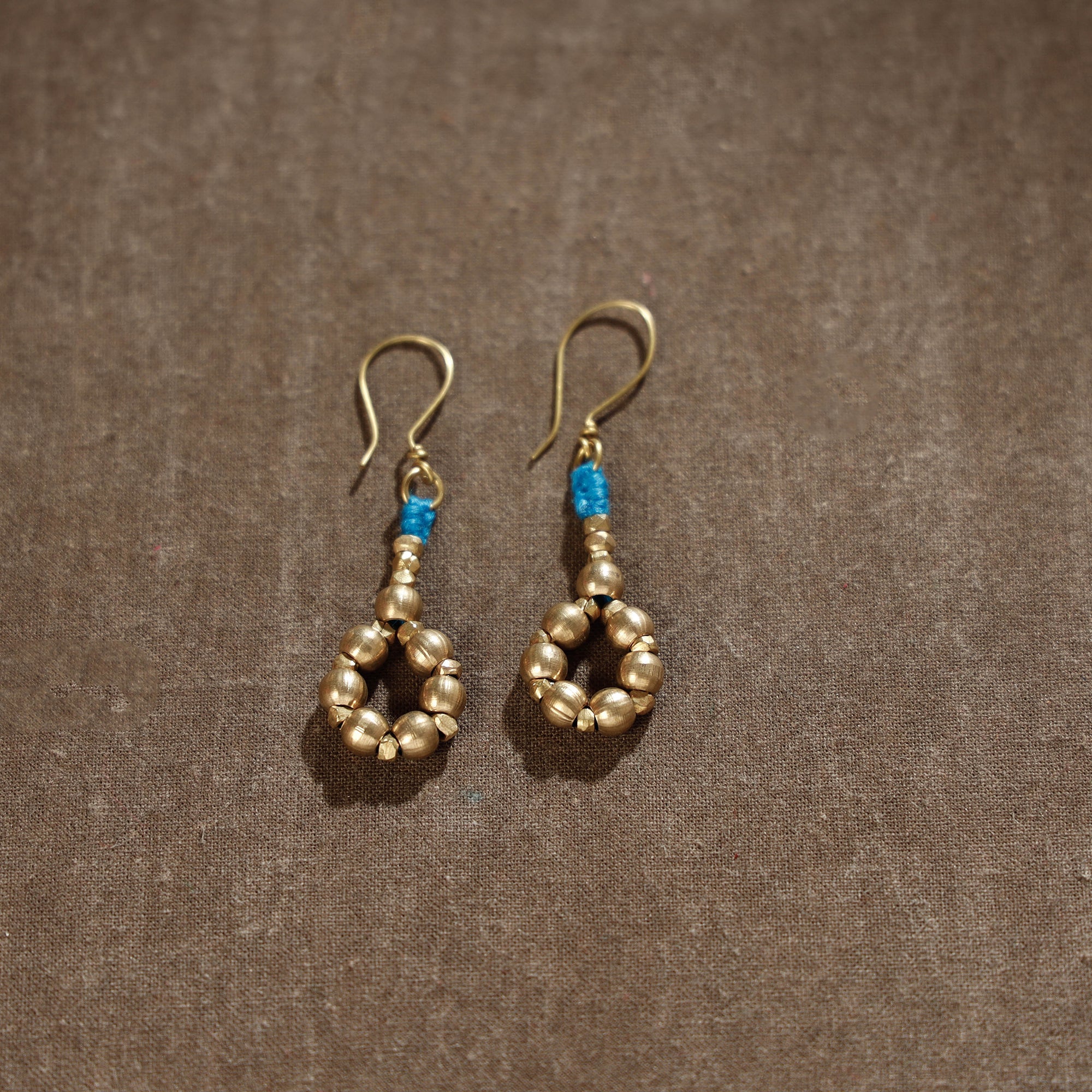 Yellow handcrafted brass metal alloy dokra beads & threadwork earrings handmade by tribes. Dokra system of metal casting is said to be the oldest form of metal casting and is technically known as ‘cire perdue’ or lost wax process. The technique of casting revolves round replacement of wax with molten metal by the traditional hollow casting method. Very intense process of Dhokra casting is currently practiced in tribal areas of India mostly around Chhattisgarh and Orissa.