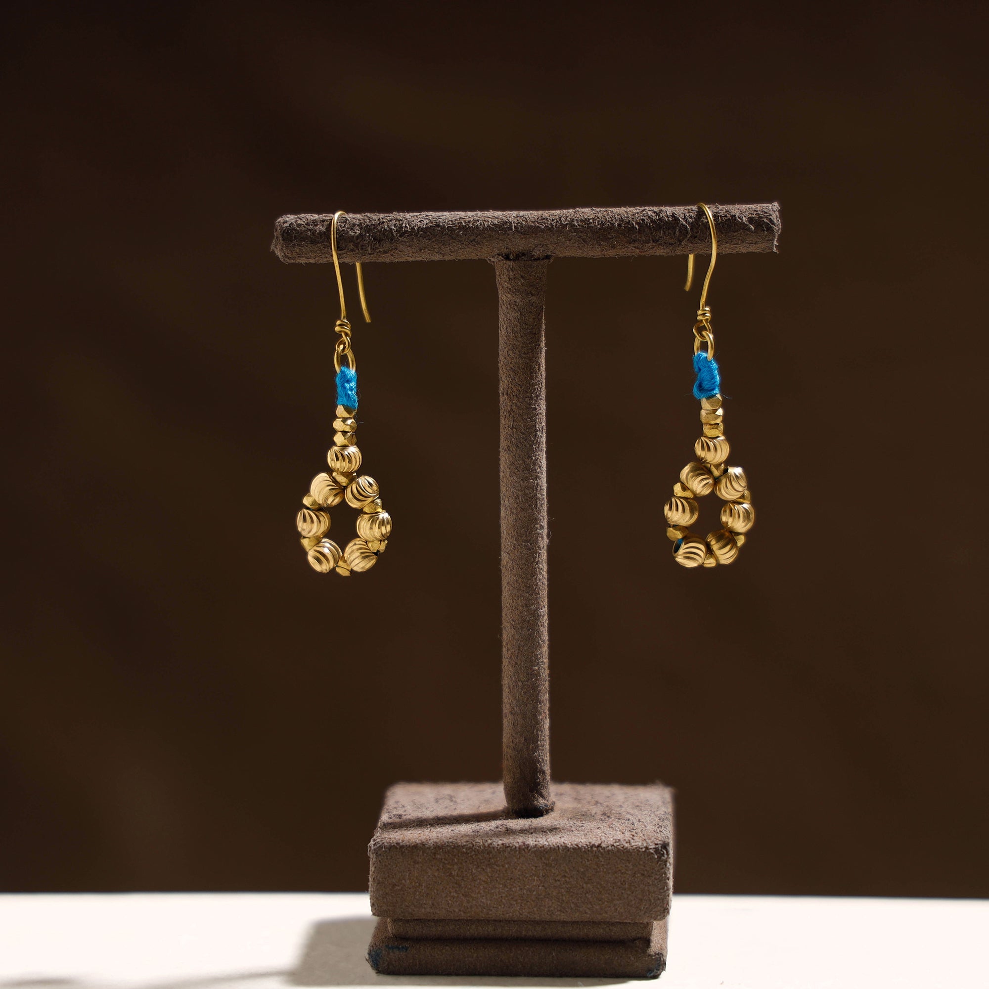 Yellow handcrafted brass metal alloy dokra beads & threadwork earrings handmade by tribes. Dokra system of metal casting is said to be the oldest form of metal casting and is technically known as ‘cire perdue’ or lost wax process. The technique of casting revolves round replacement of wax with molten metal by the traditional hollow casting method. Very intense process of Dhokra casting is currently practiced in tribal areas of India mostly around Chhattisgarh and Orissa.