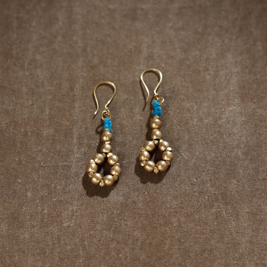 Yellow handcrafted brass metal alloy dokra beads & threadwork earrings handmade by tribes. Dokra system of metal casting is said to be the oldest form of metal casting and is technically known as ‘cire perdue’ or lost wax process. The technique of casting revolves round replacement of wax with molten metal by the traditional hollow casting method. Very intense process of Dhokra casting is currently practiced in tribal areas of India mostly around Chhattisgarh and Orissa.