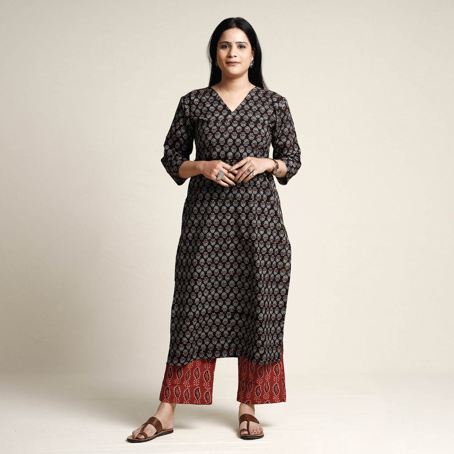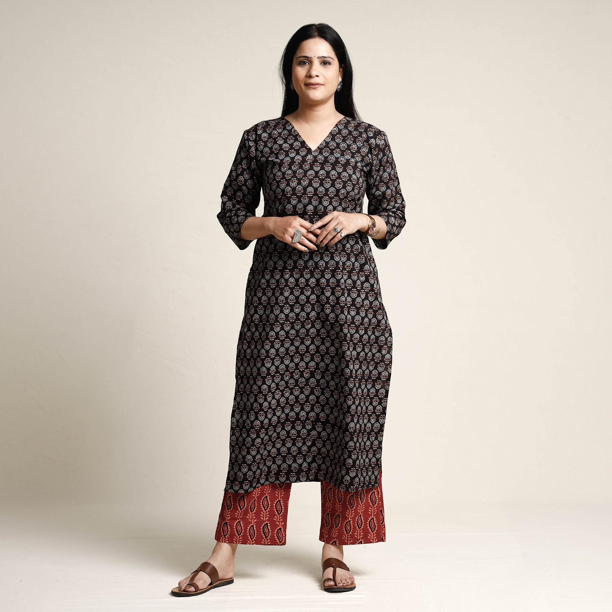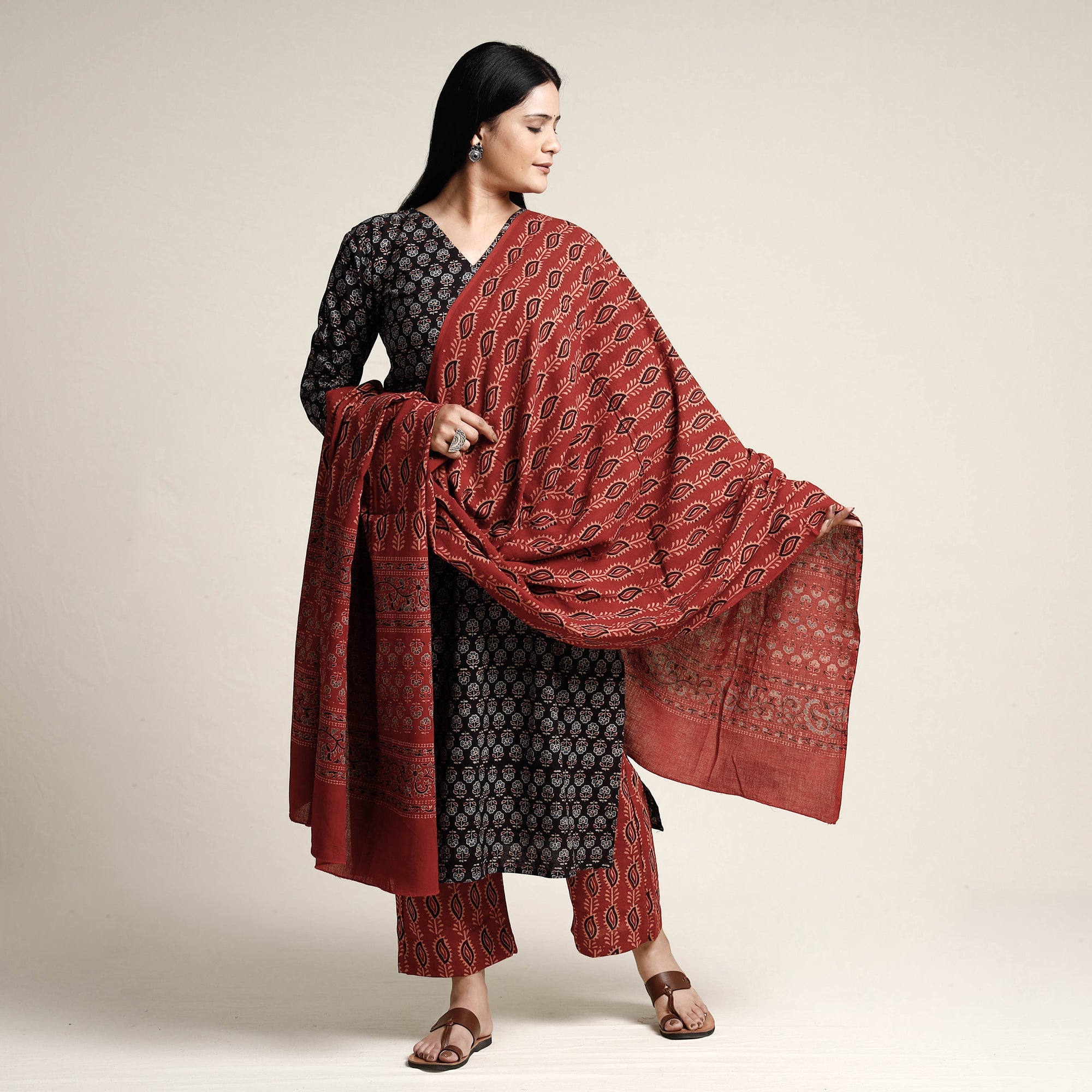 Look and feel beautiful in this uniquely designed ajrakh hand block printed cotton long kurta with palazzo & dupatta set made using natural dyes. This suit set contains a cotton kurta, palazzo, and cotton dupatta. The kurta has one side pocket, and the palazzo has two side pockets. This cotton suit makes you comfortable with ease all day long. This suit is perfect for your daily outing and for a special occasion.