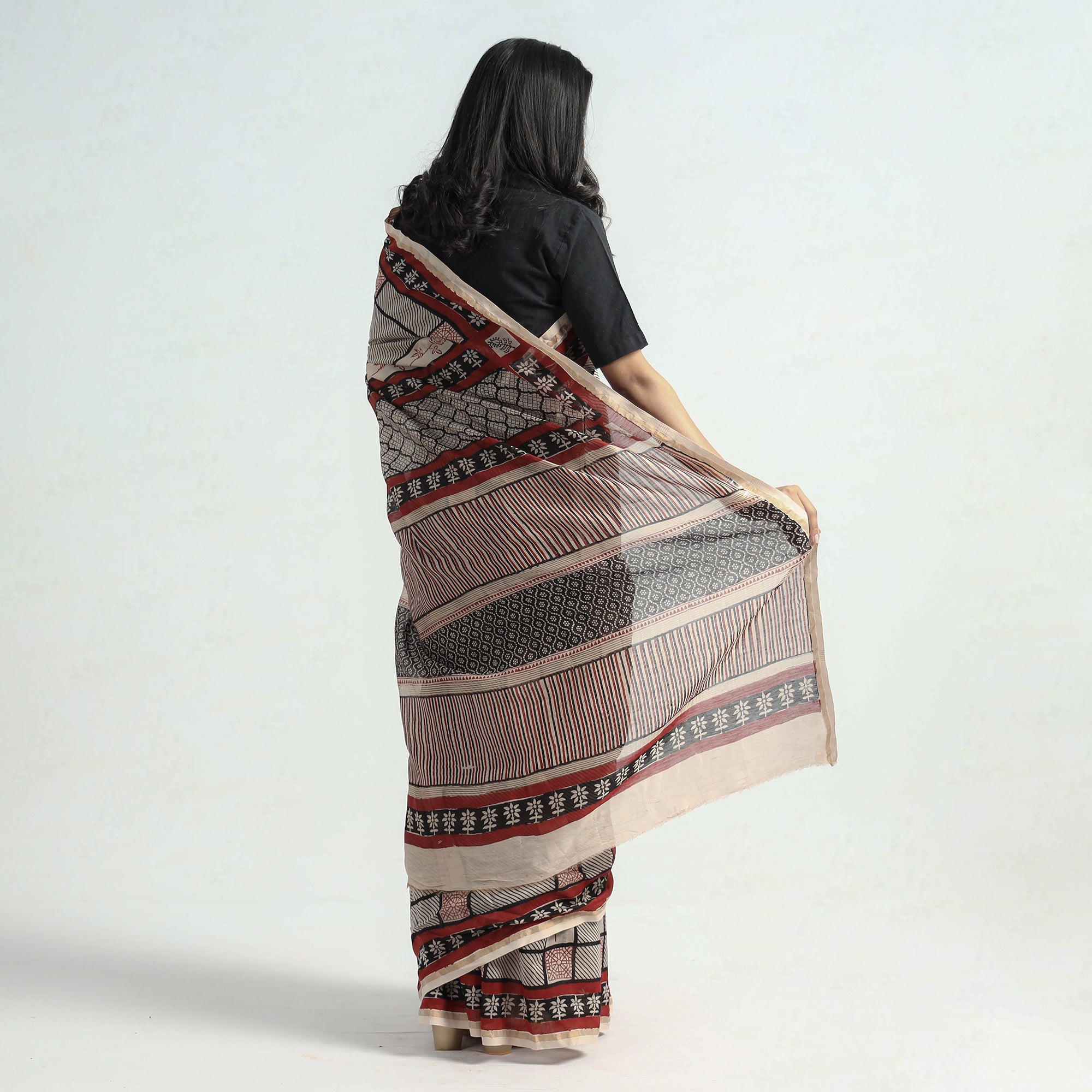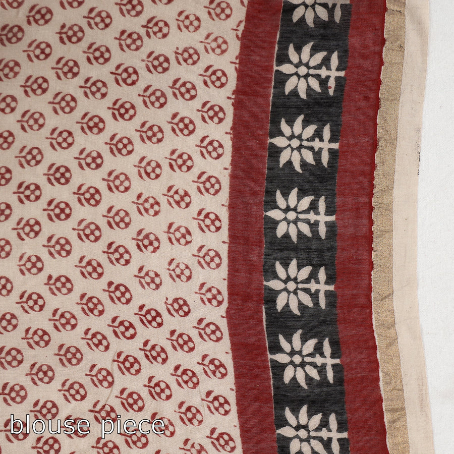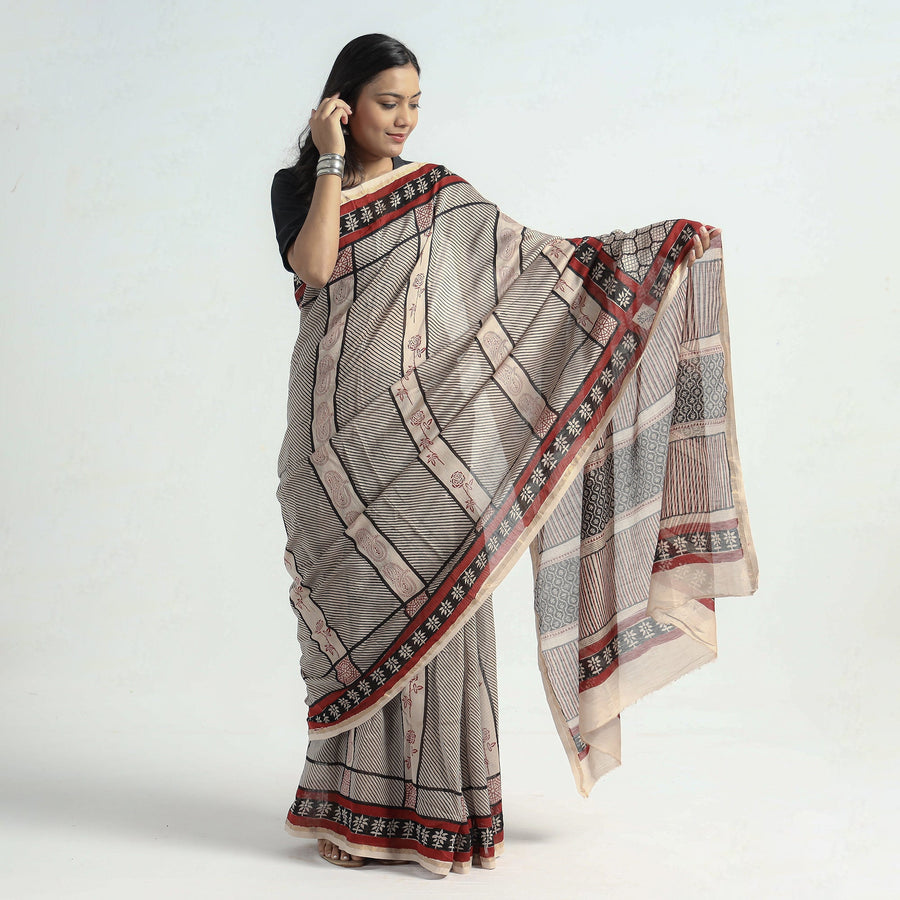 Experience the elegance of a beige Bagh block-printed chanderi silk saree. Created by master artisan Bilal Khatri, this exquisite piece showcases intricate motifs and vibrant colours achieved through traditional hand block printing. Made with natural dyes, it embodies the rich cultural heritage of Bagh, in the Dhar district of Madhya Pradesh.
