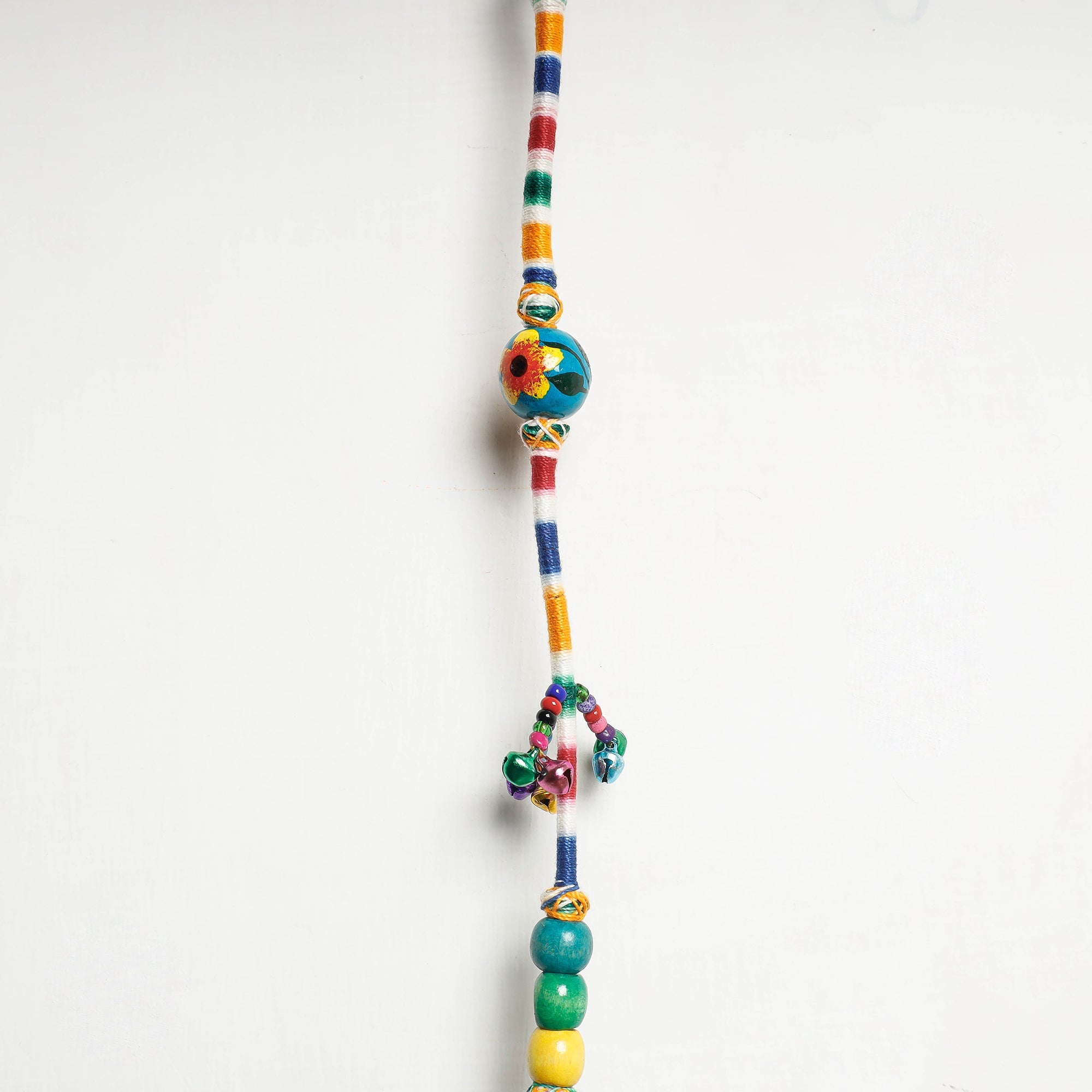 | Material | Patwa hanging made from thick weaves of thread with bell & glass beads handcrafted by the master craftsman Kailash Patwa. Patwa is a thread craft which originated in Rajasthan and is now practised in parts of Rajasthan. The word Patwa has been derived from the Hindi word ‘pat’ meaning silk and those involved in the silk and cotton thread business are called Patwas. |