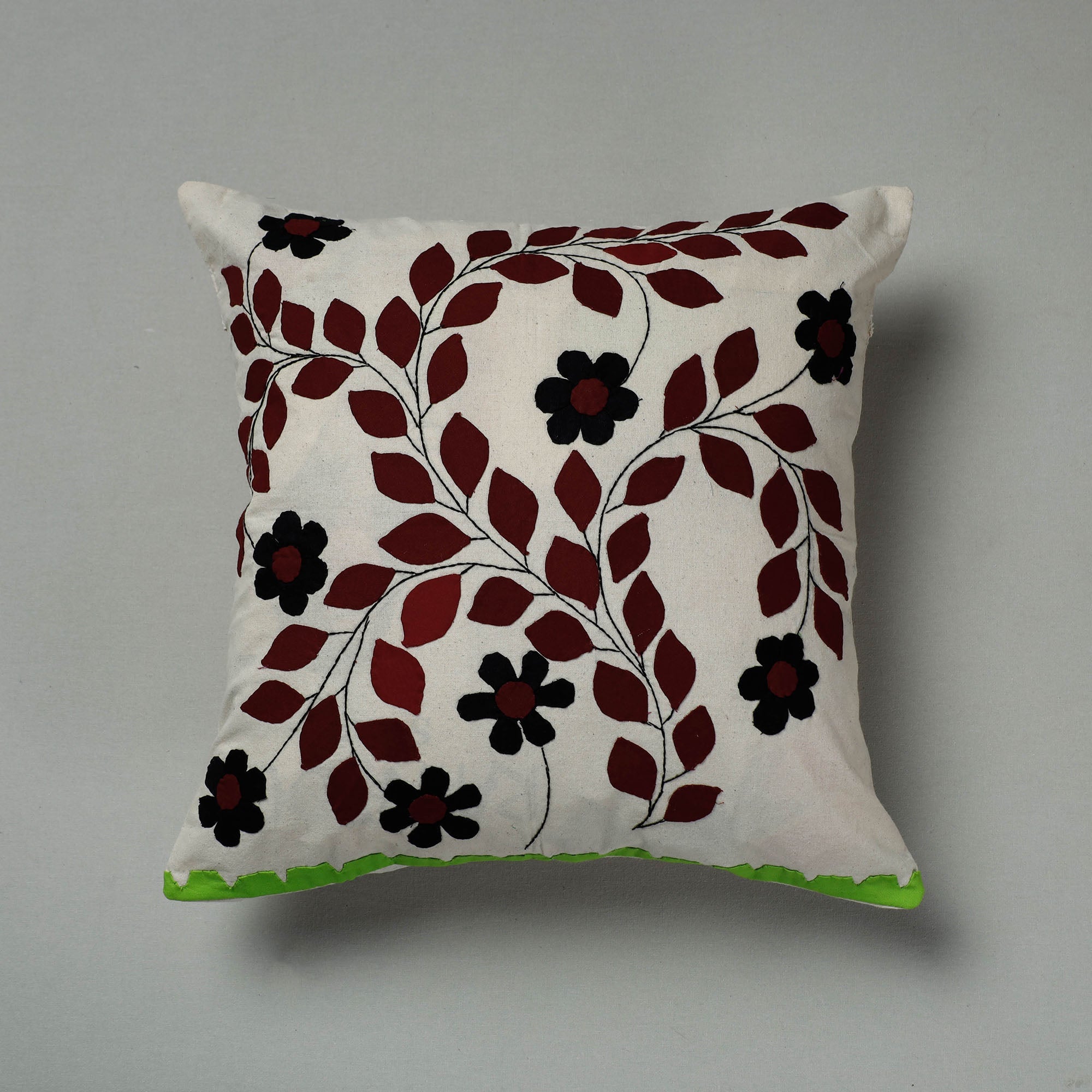 Tribal design hand stitched brown pipli applique work cushion cover made from pure cotton fabrics, handcrafted by artisans of Pipili, the hub of traditional art & craft in Odisha.