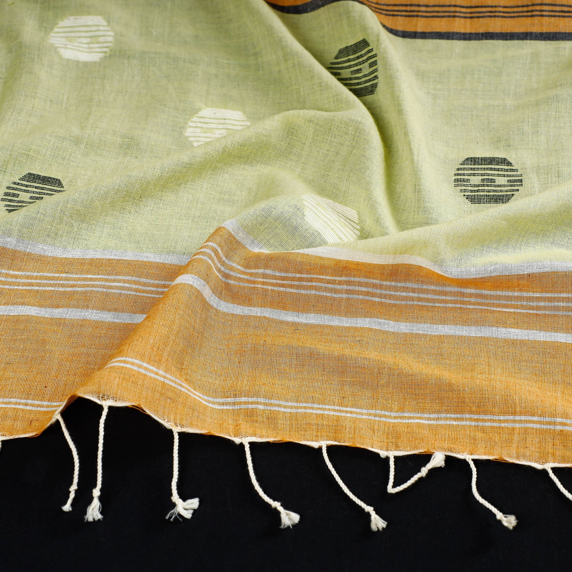 This exquisite burdwan jamdani buti handloom pure cotton stole with tassels is crafted by the artisans of Bengal. Jamdani (extra weft) weaving, a style unique to Bengal…literally like "hand embroidery" on the loom. The method of weaving resembles tapestry work, in which small shuttles of coloured, gold, or silver threads are passed through the warp.