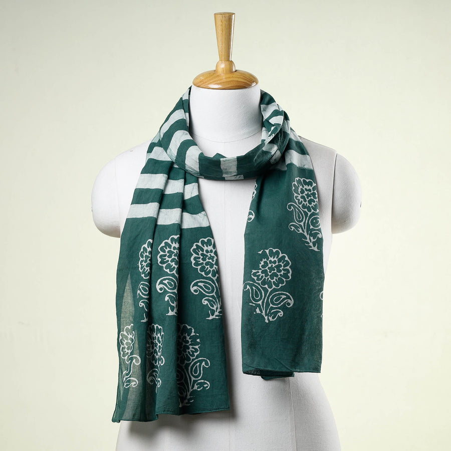 This green batik hand block printed pure cotton stole is crafted from cotton fabric, known for its softness and breathability. This stole is meticulously handcrafted using the traditional technique of batik hand block printing. Skilled artisans employ wax-resist dyeing and hand block printing methods to create intricate patterns and designs on the fabric. Batik is a technique of wax-resist dyeing applied to whole cloth, or cloth made using this technique. The traditional designs and motifs in Indian batik are often passed down from one generation to another.