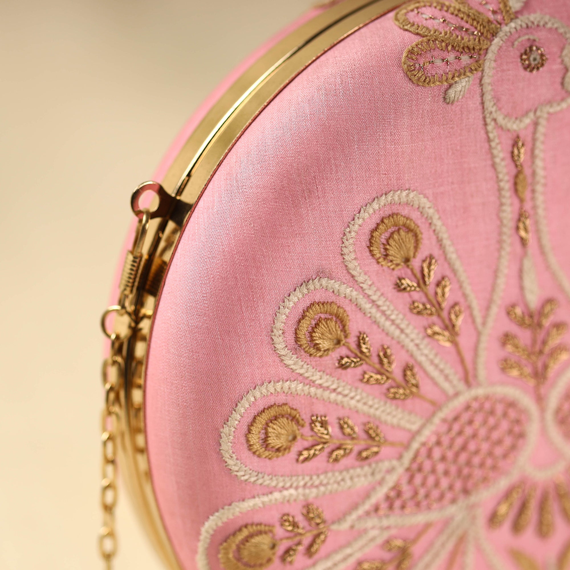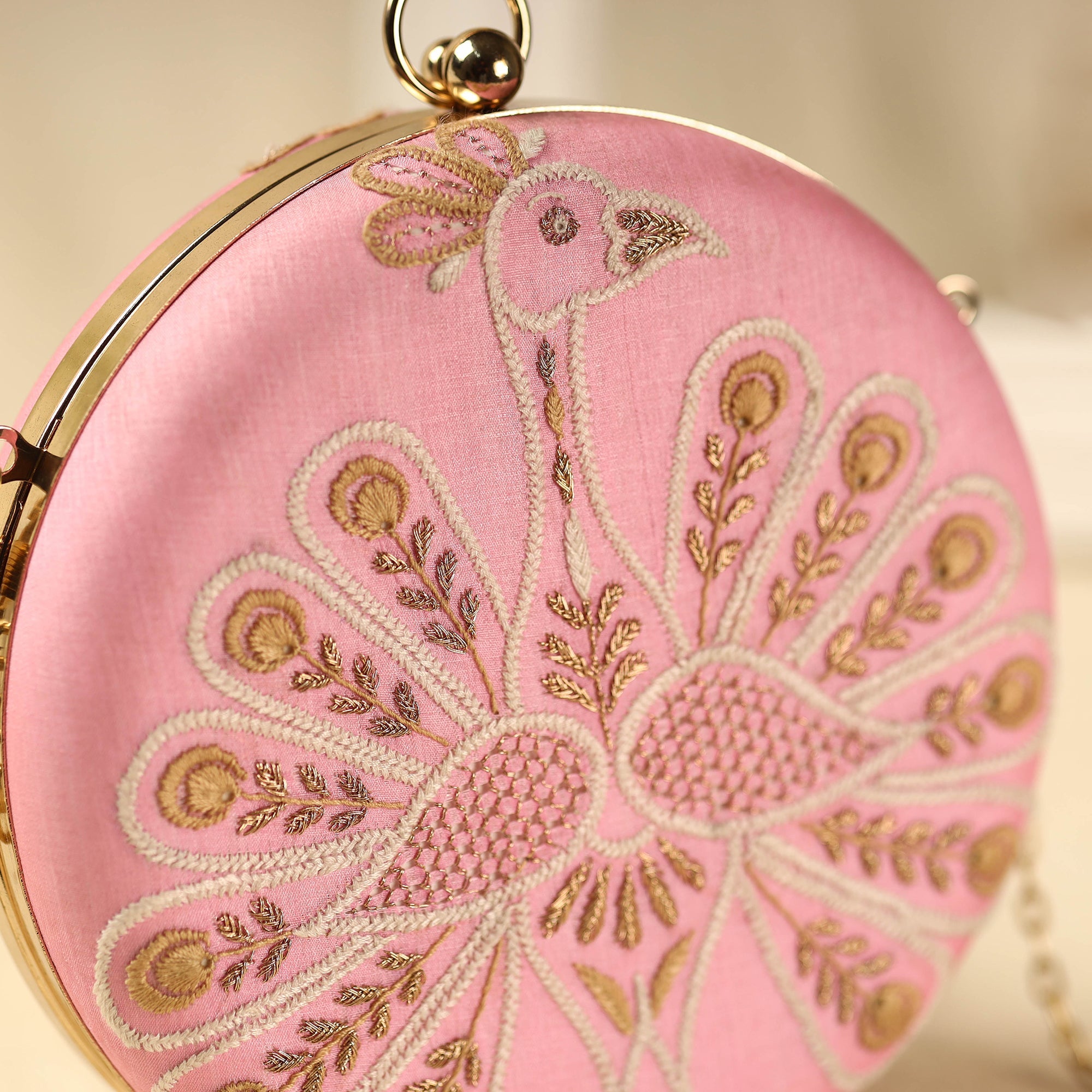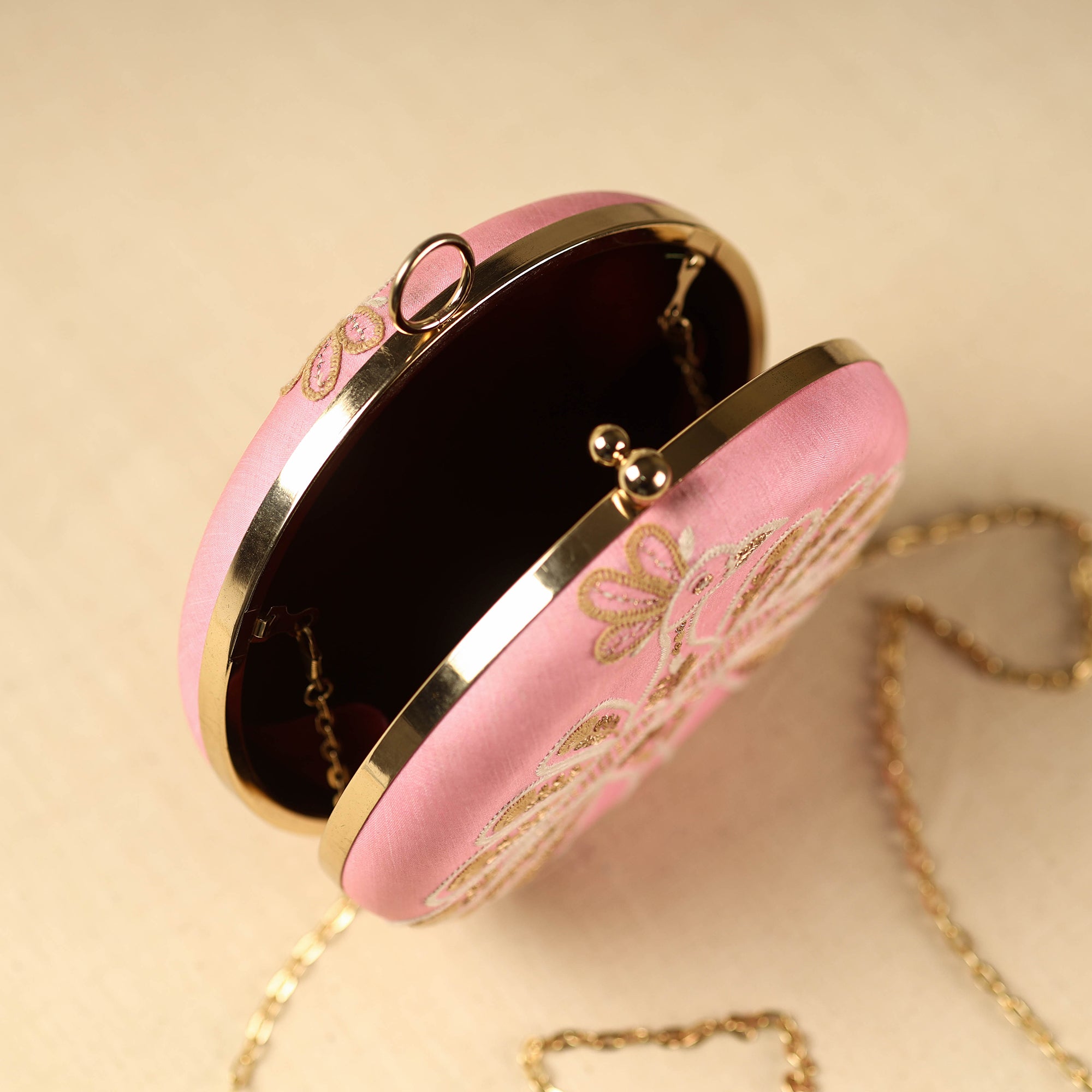Intricate and artfully done pink lucknowi chikankari thread and zari hand-embroidered tussar silk clutch/sling bag with detachable sling. This bag can be converted into a clutch after detaching the sling. It has a velvet lining inside. It has ample space to keep most of your essentials. Chikankari is a traditional textile decoration from Lucknow. It is very delicate and intricate hand embroidery work where thread and zari are embroidered in cool, pastel shades on light fabrics.