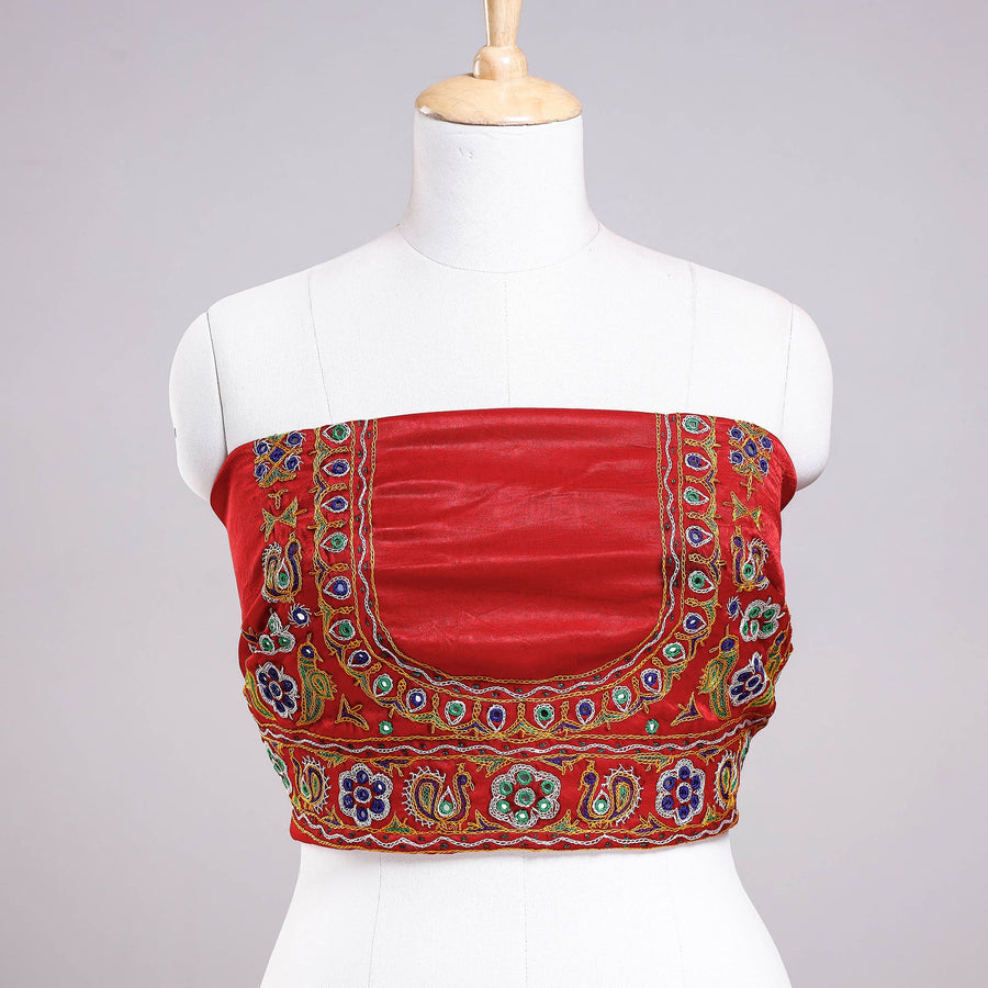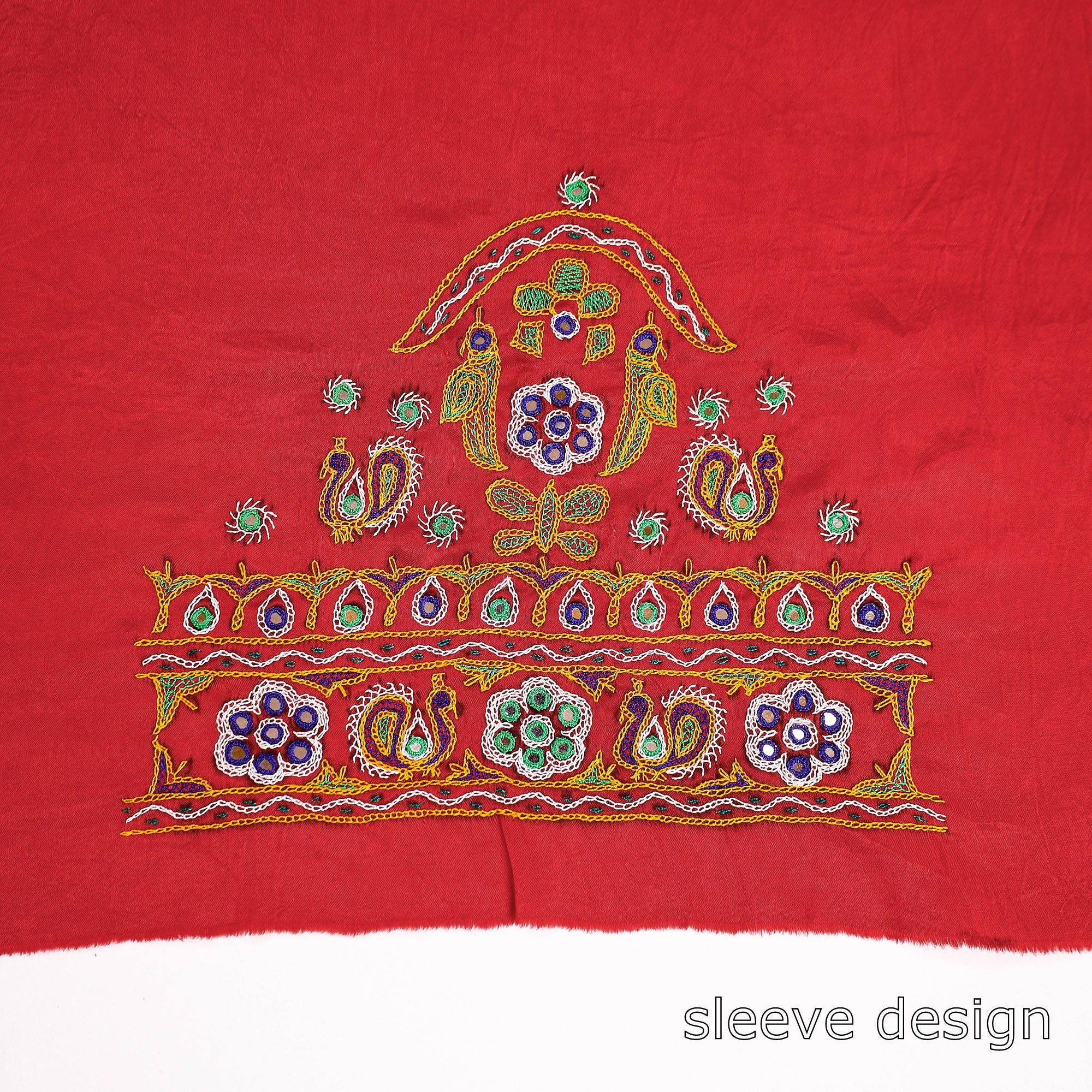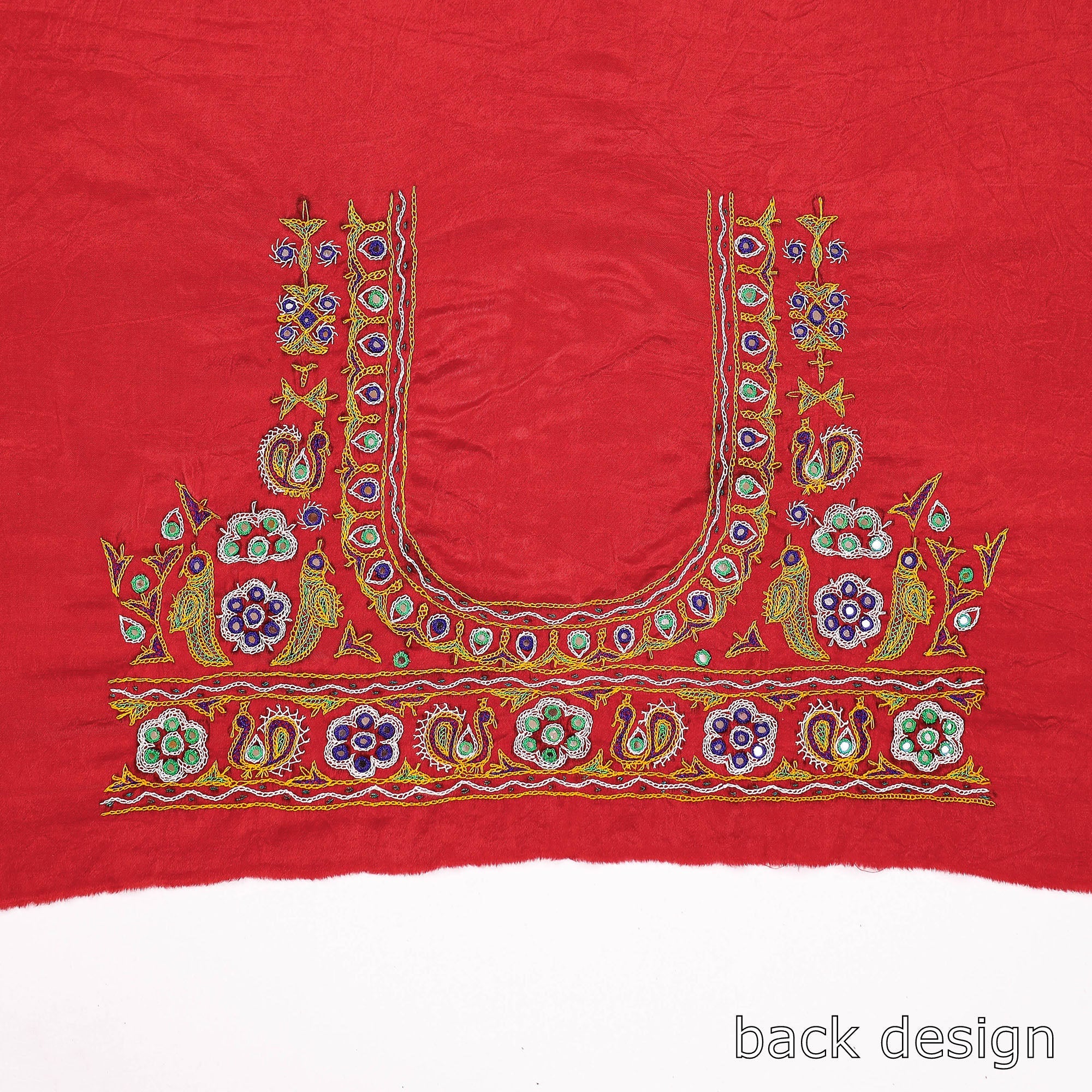 Fine quality ahir hand embroidery kutch mirror work mashru silk blouse piece. The kutch embroidery is a handicraft and textile signature art tradition of the tribal community of kutch district in Gujarat. This embroidery with its rich designs has made a notable contribution to the Indian embroidery traditions. The embroidery, practiced normally by women is generally done on fabrics of cotton & Silk, in the form of a net using cotton or silk thread.