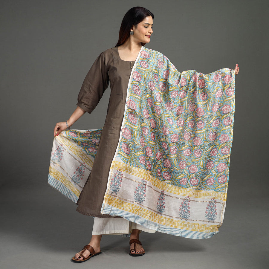 Fine quality sanganeri hand block printed chanderi silk dupatta made using bleed-free VAT dyes. Sanganeri is a hand-block printing technique originating from Sanganer, a village in the southern part of Jaipur, Rajasthan. Chanderi silks are known for its gossamer looks and amazing feel.