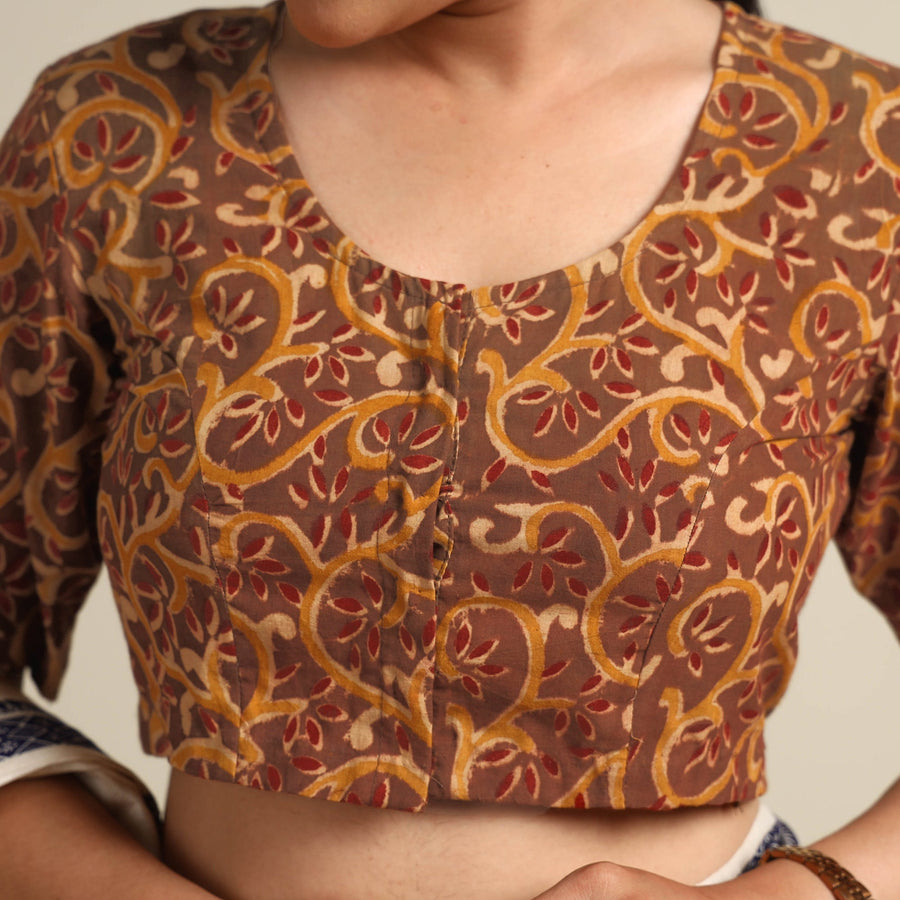 This kalamkari block-printed stitched blouse is made from cotton fabric, offering comfort all day long. It features intricate designs created using natural dyes and traditional hand-block printing techniques. With its cultural charm, this blouse is a perfect addition to any outfit.