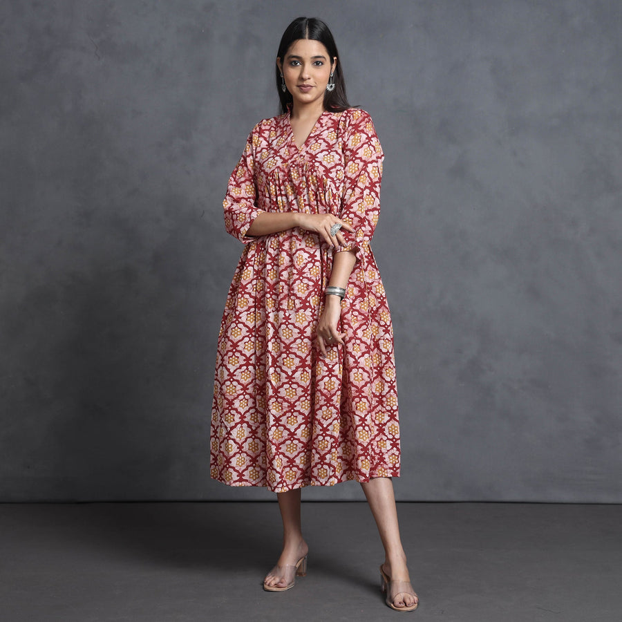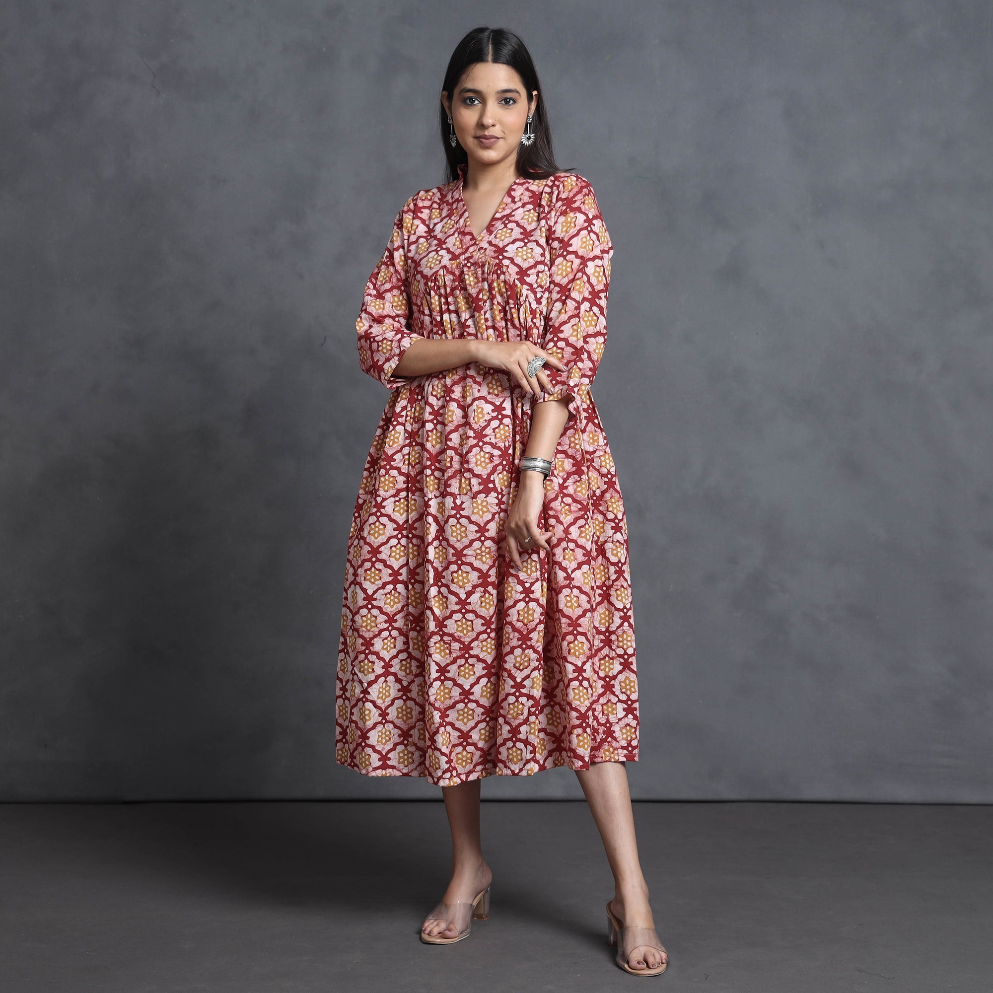 Look and feel beautiful in this uniquely designed hand batik printed cotton dress with flared gher. This cotton dress makes you comfortable with ease all day long. This dress is perfect for your daily outing and for a special occasion.