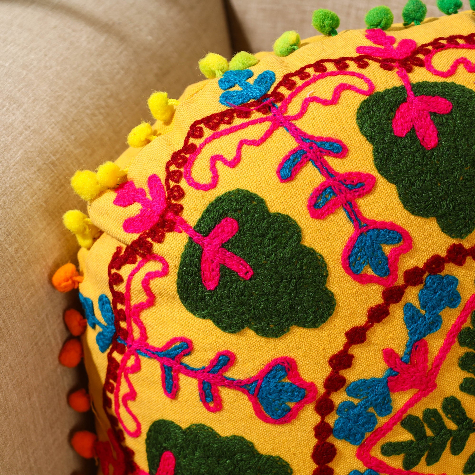 | Material | Made from canvas cotton this yellow suzani embroidery cushion cover features suzani embroidery done by machine. Designed for practicality it includes a zipper closure for easy use. Perfect for sofas, chairs, or beds, it adds comfort and style to your living space. Ideal for daily use this cover combines elegance, durability, and convenience in one. |